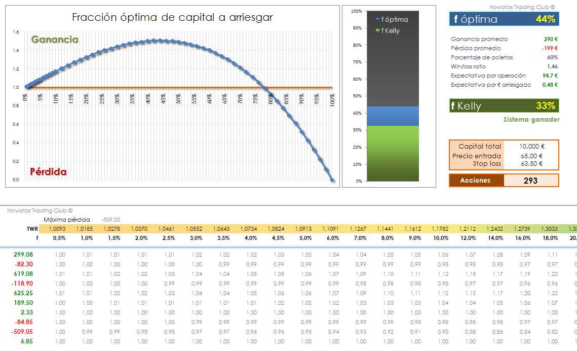 Para conocer cómo se calcula la f óptima, puedes leer el libro de Óscar Cagigas «Trading con gestión de capital».