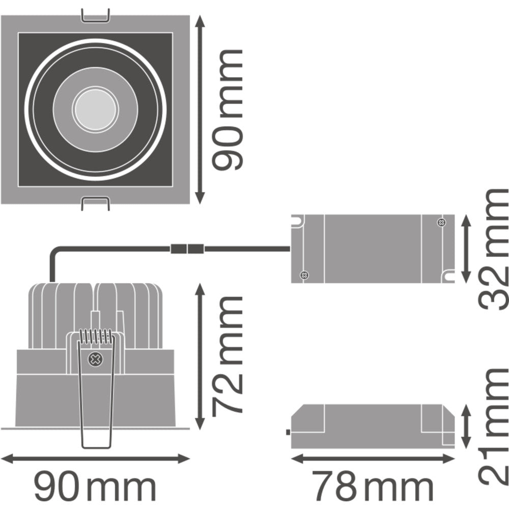 Foco empotrado, ajustable, forma cuadrada. Características del producto: Ángulo de inclinación ajustable: +/- 20°. Consistencia del color inicial: = 4 SDCM. Material de la lente: PMMA. Beneficios del producto: Ángulo de corte para una cómoda iluminación interior. Alta eficacia luminosa. Carcasa de aluminio para una mejor disipación del calor. Ahorro energético de hasta 90 % en comparación con los focos spot halógenos. Driver externo para una mayor flexibilidad (compatible con drives DALI seleccionados). Sustitución sencilla del driver externo gracias al enchufe con cierre de bayoneta. El diseño coincide con la familia de luminarias LEDVANCE Spot, Downlight y Tracklight. 5 años de garantía. Áreas de aplicación: Sustituto de focos spot halógenos. Iluminación de acento general. Tiendas, boutiques. Habitaciones de hotel. Restaurantes, bares. Galerías, museos. Interiores residenciales. Equipamiento / Accesorios: Incluido controlador.