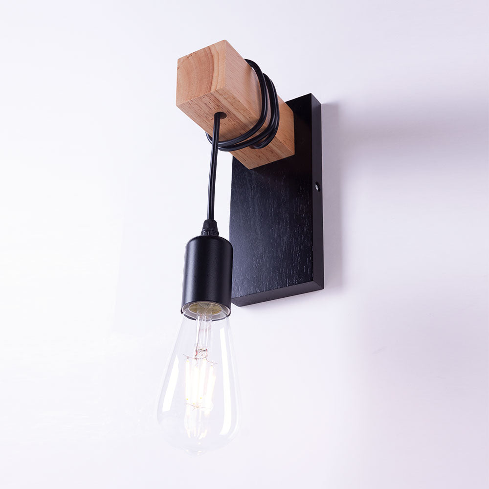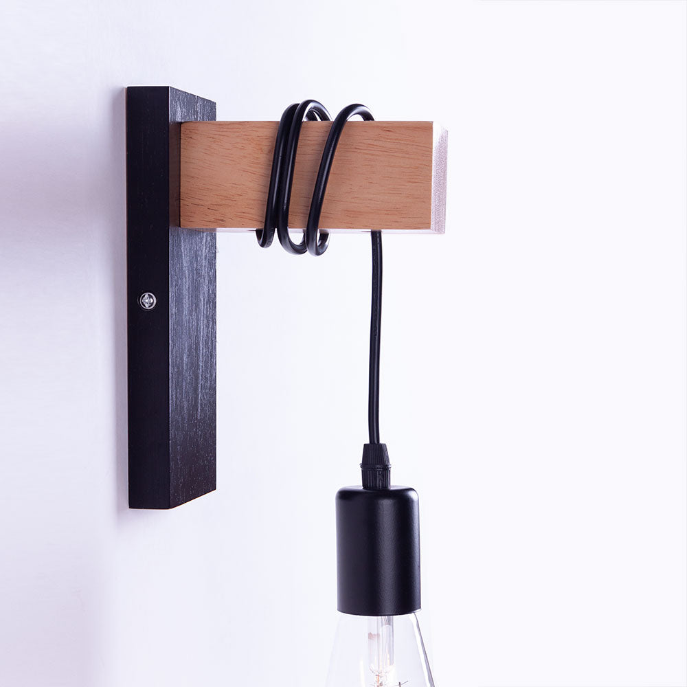 El aplique “Elle” es un aplique con acabado en negro y madera, que incluye un pequeño cable colgante para darle un toque más moderno. Ideal como complemento para decoraciones que incluyan madera o ladrillo, el aplique de pared “Elle” también casa con decoraciones vintage, ya que se puede combinar con alguna bombilla retro para formar una pareja perfecta. Ilumina a la perfección pequeños espacios, se puede usar a los lados de una cama para tener una buena luz de lectura.