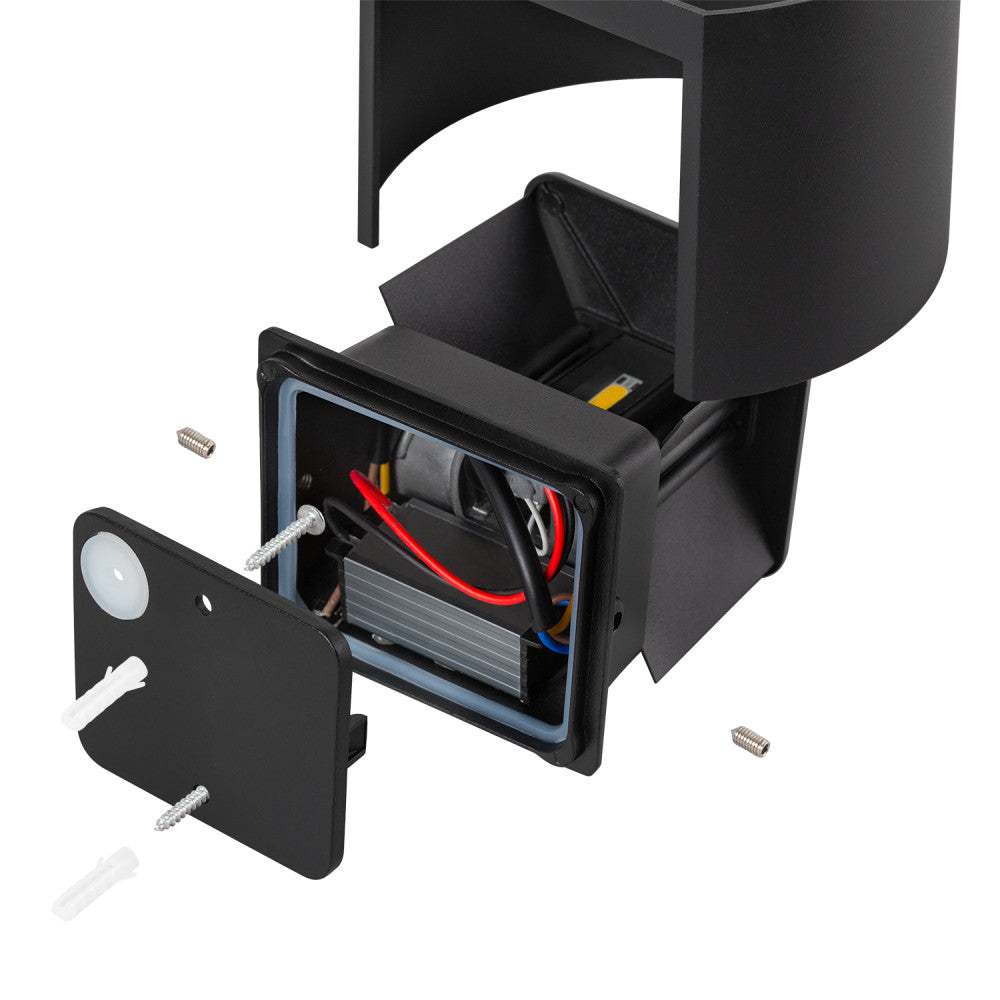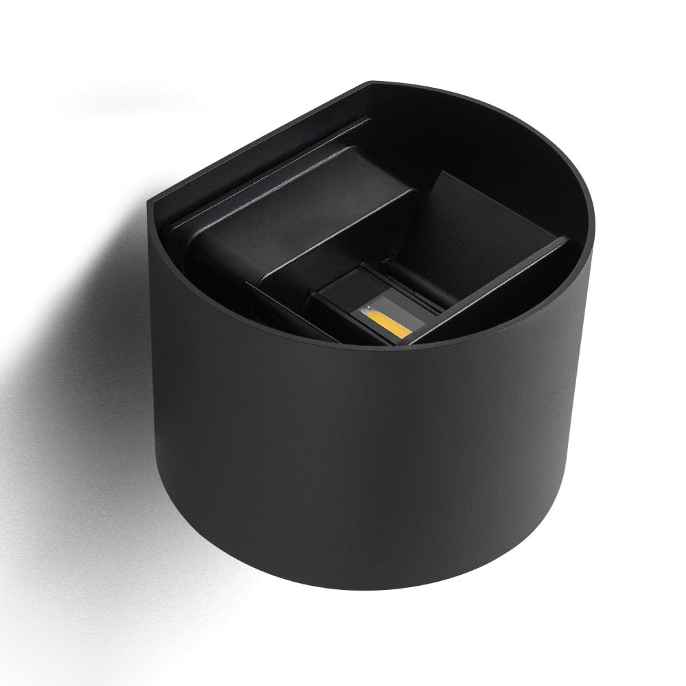 Aplique de pared de 10 W para exteriores. Fabricado de aluminio, con un diseño moderno y elegante. Emite su haz de luz tanto hacia arriba como hacia abajo. Se puede ajustar la apertura de luz desde dos tablas de cambios en el interior que se pueden girar.