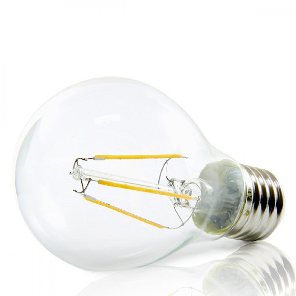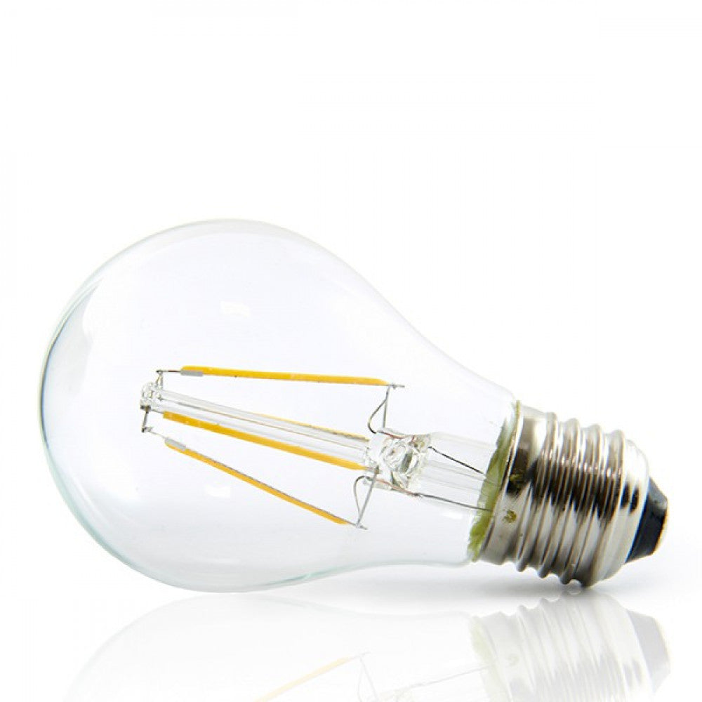 La bombilla LED E27 con 4 W de potencia es el reemplazo directo de las bombillas de rosca gorda de 25 W. Los filamentos LED que integra tienen un rendimiento lumínico de 95 lm/W. Además, proporciona un flujo luminoso de 380 Lm distribuidos uniformemente por un difusor de cristal transparente de donde se obtiene un índice de reproducción cromático de 80. La luz que emite se reparte de forma muy uniforme en un ángulo de 360º.