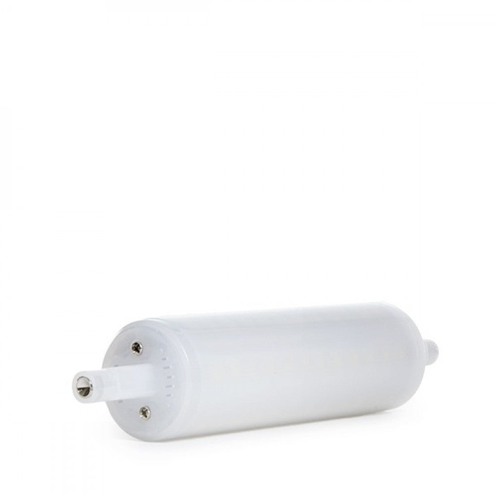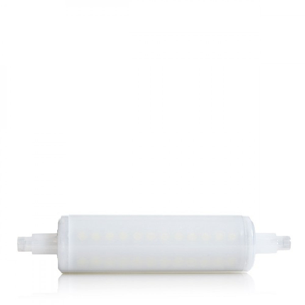 La Lámpara de LEDs con casquillo R7S de 118 mm, y un diámetro de 25 mm, con un ángulo de apertura de 360 grados, ofrece soluciones para ambientes interiores tanto para uso industrial como residencial. Puede ser instalada directamente a las tomas de corriente suministradas por la red eléctrica (85-265 VAC) con una frecuencia de servicio de 50/60 Hz Cuenta con una alta eficacia (100 LmW) consumiendo 10 W mediante LEDs del tipo SMD2835 y logrando proporcionar un flujo luminoso de 1000 Lm distribuidos uniformemente por un difusor de plástico opalizado de donde se obtiene un índice de reproducción cromática de 80. Aporta una iluminación equivalente a una bombilla incandescente de 75 W, su consumo representa un valor de 10kWh1000h, reduciendo la cantidad de energía facturada y las emisiones de gases contaminantes a la atmósfera. La lámpara tiene un grado de protección IP25 (válido para polvo y humedad en interiores), es suficientemente robusto como para cumplir las exigencias mecánicas requeridas.