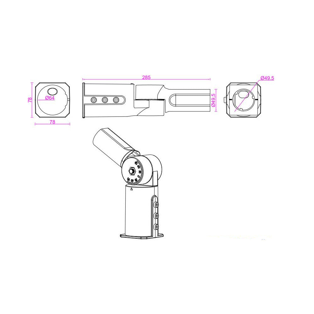 Brazo articulado de aluminio diseñado para la instalación de una luminaria de alumbrado público a un poste o columna de carretera. La parte de mayor diámetro se fija a columnas con un máximo de Ø65 mm. La parte de menor diámetro incorpora tres tornillos para fijar luminarias de Ø50 mm en un ángulo de 0 a 180º.