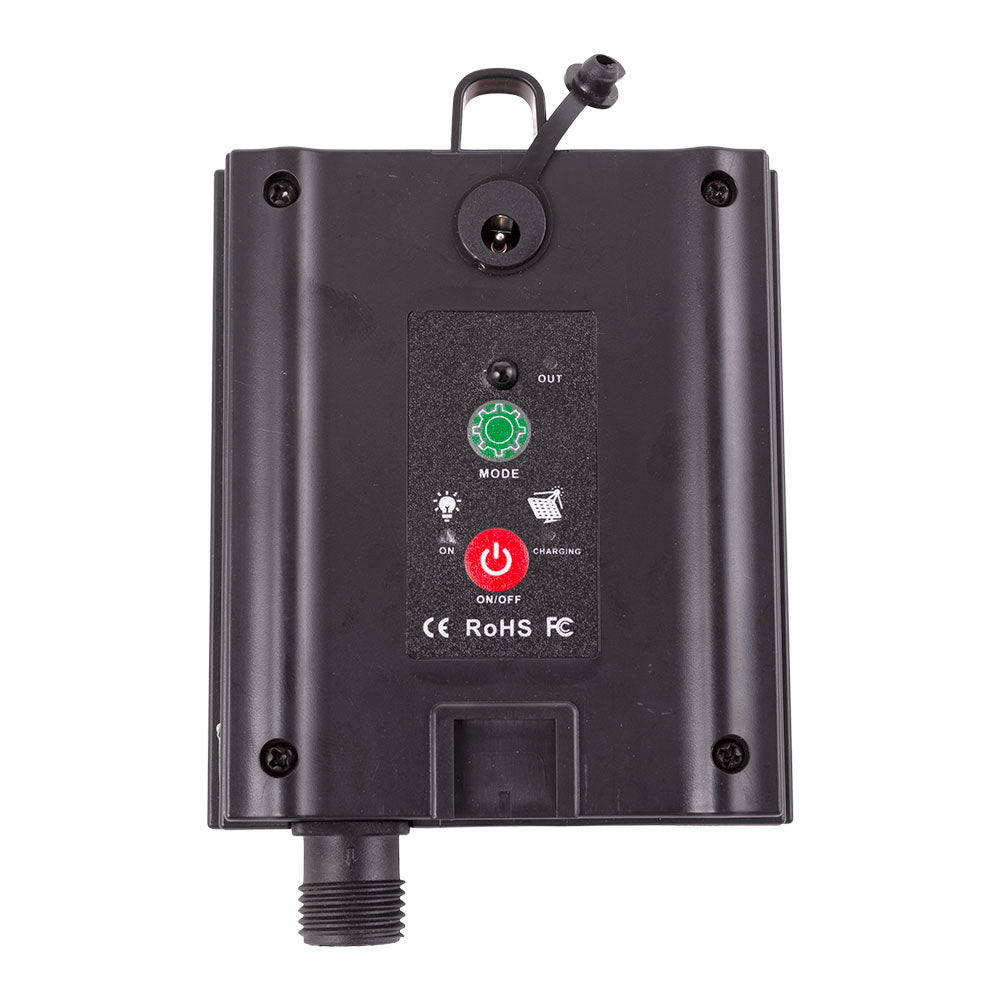 Botón 5 H: activa la cadena de bombillas LED LED durante un periodo continuo de 5 horas, y repite el proceso en los días sucesivos. Botón 8 H: activa la cadena de bombillas LED LED durante un periodo continuo de 8 horas, y repite el proceso en los días sucesivos. Botón máxima luminosidad: Aumenta la luminosidad en intervalos de 20% hasta llegar al 100% Botón mínima luminosidad: Disminuye la luminosidad en intervalos de 20% hasta llegar al 20% *Autonomía 10 horas carga completa. *Largo cable panel- cadena de bombillas LED: 9,5 metros.
