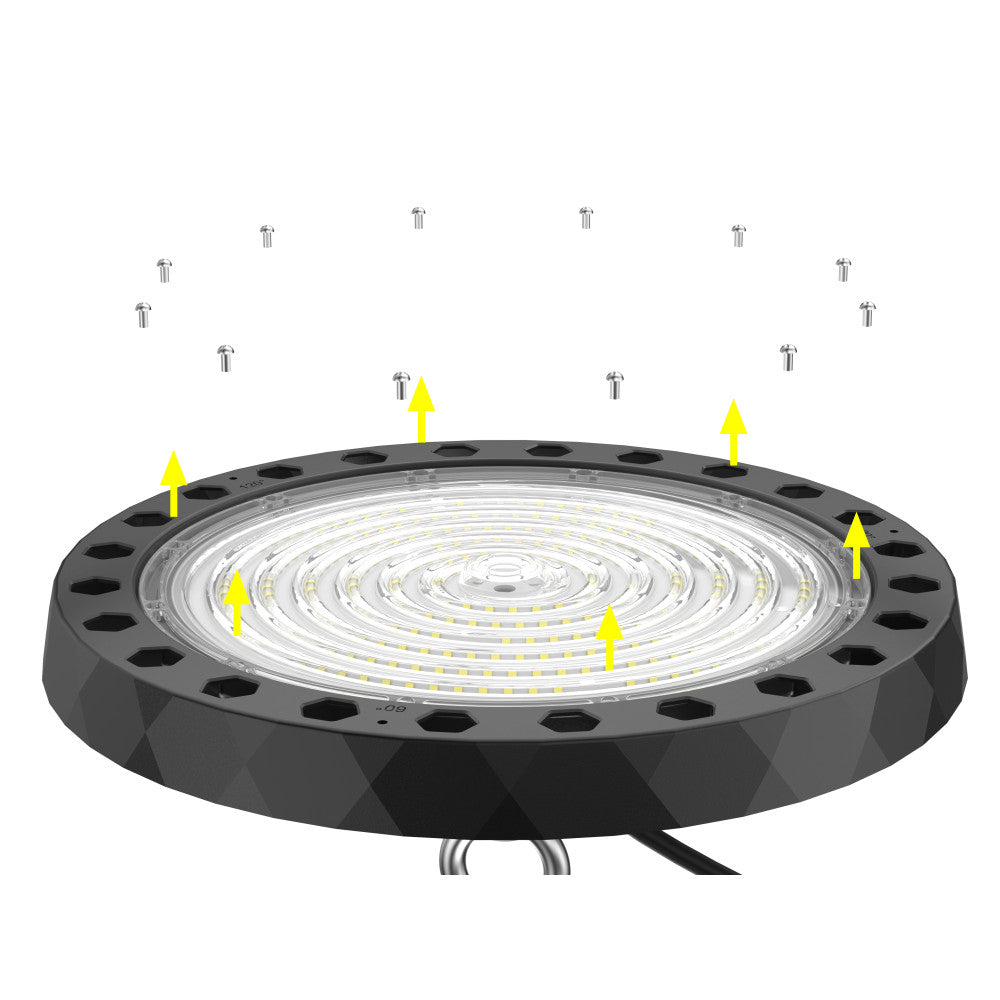 Se emplea en todo tipo de zonas industriales o de trabajo, como pueden ser naves industriales, talleres, fábricas, almacenes o parkings. Permite regular la intensidad mediante TRIAC. Este modelo de campana Led permite la regulación del ángulo de apertura sin necesidad de cambiar el difusor ni la óptica, para regular este ángulo debe seguir los siguientes pasos. Desatornillar los tornillos perimetrales del difusor.