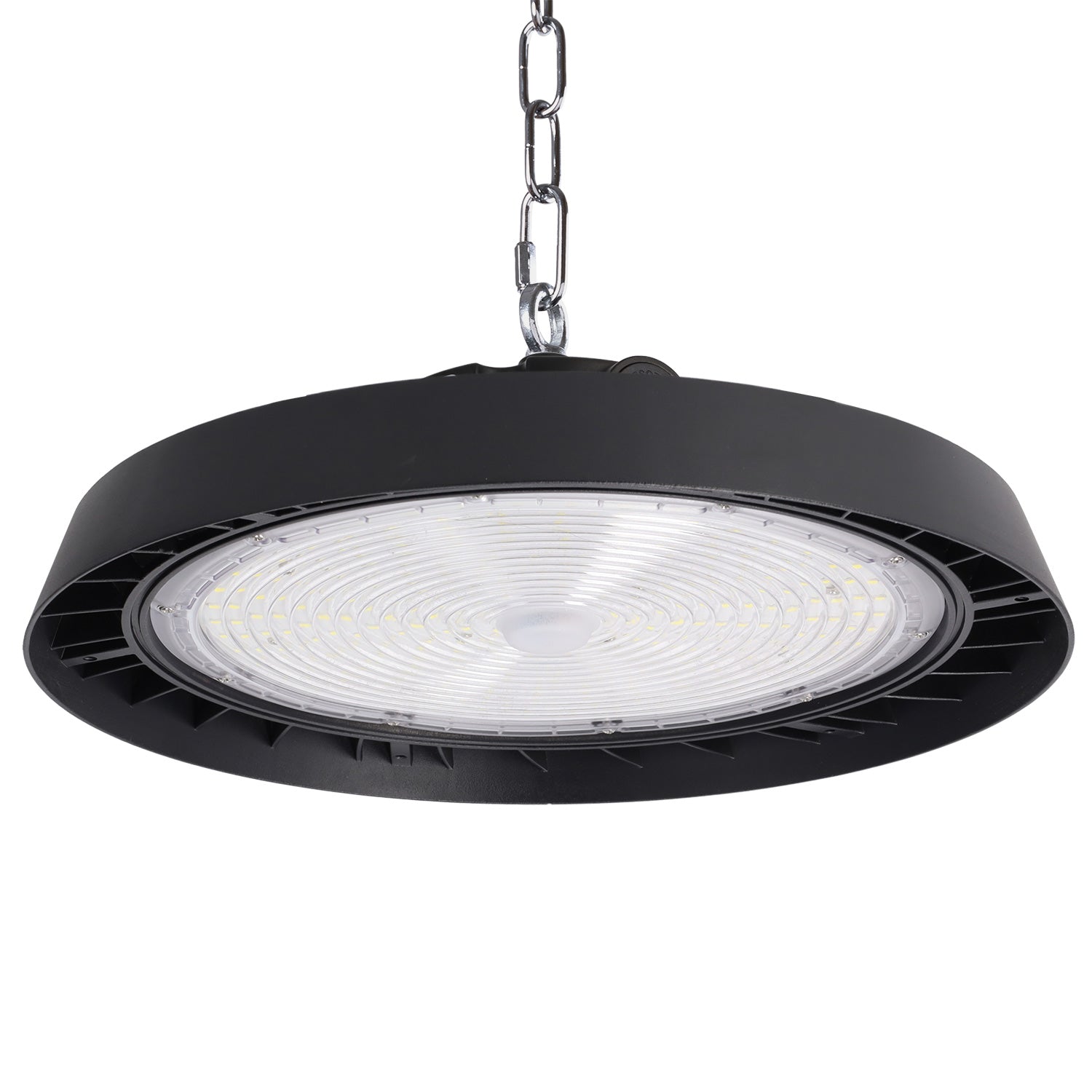 Incorpora LEDs de alta eficiencia con chip Philips Lumileds SMD, garantizando consistencia fotométrica y larga durabilidad (L80 > 50.000 h). La temperatura de color de 5000K (luz fría) mejora la visibilidad en entornos técnicos o industriales, reduciendo la fatiga visual. Especificaciones Técnicas: Potencia nominal: 200 W Flujo luminoso: 40.000 lúmenes Eficiencia luminosa: 200 lm/W Temperatura de color (CCT): 5000K (luz fría – blanco día) Índice de reproducción cromática (CRI): >80 Driver: PHILIPS Xitanium – regulable 1-10 V (flicker-free) Óptica: Haz simétrico de 90º Protección: IP65 – IK9 Rango de temperatura de operación: -30ºC a +50ºC Cuerpo: Aluminio inyectado con acabado negro anodizado Montaje: Suspensión mediante gancho / opcional adaptador para campana Vida útil: L80 > 100.000 h Factor de potencia (PF): >0.99 THD: <15% Aplicaciones recomendadas: Naves industriales y logísticas Centros de distribución Talleres, plantas de producción Superficies deportivas cubiertas Zonas con requerimientos de alto rendimiento lumínico