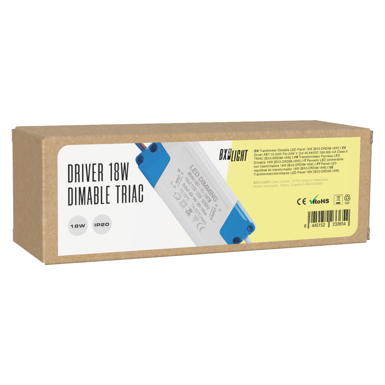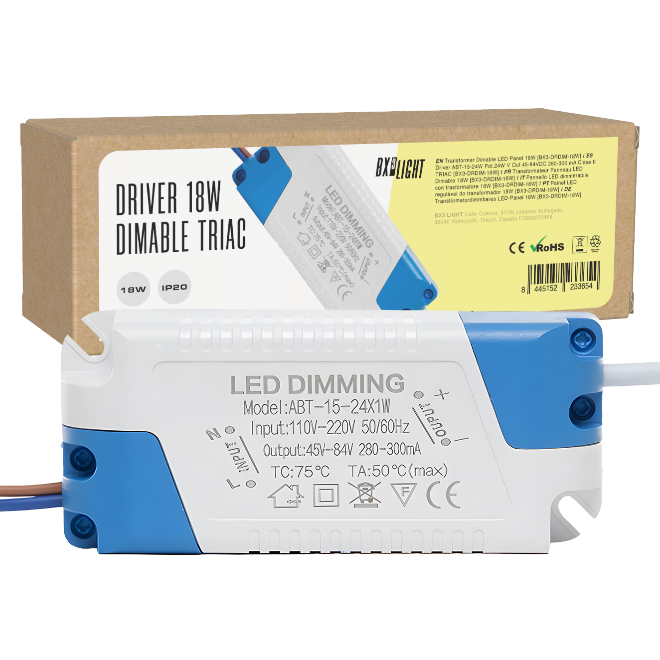 El Driver LED ABT-15-24 W 24 W BX3 LIGHT con regulación TRIAC es una fuente de alimentación de corriente constante diseñada para luminarias LED regulables mediante sistemas de corte de fase, ofreciendo estabilidad eléctrica y compatibilidad con reguladores tradicionales. Especificaciones técnicas: Potencia nominal: Hasta 24 W Rango de corriente de salida: 280–300 mA (corriente constante) Rango de tensión de salida: 45–84 V DC Sistema de regulación: TRIAC (corte de fase – leading/trailing edge) Clase de protección: Clase II (doble aislamiento) Alta eficiencia energética Funcionamiento sin parpadeos (flicker free) Características principales: Compatible con reguladores de pared tipo TRIAC Regulación suave y estable de la intensidad lumínica Protección contra sobrecarga, sobretensión y cortocircuito Amplio rango de tensión de salida para diferentes configuraciones LED Ideal para downlights, paneles LED y luminarias técnicas en proyectos residenciales y comerciales Fabricado bajo los estándares de calidad de BX3 LIGHT, garantiza rendimiento fiable, estabilidad eléctrica y regulación eficiente en instalaciones LED con control por corte de fase.
