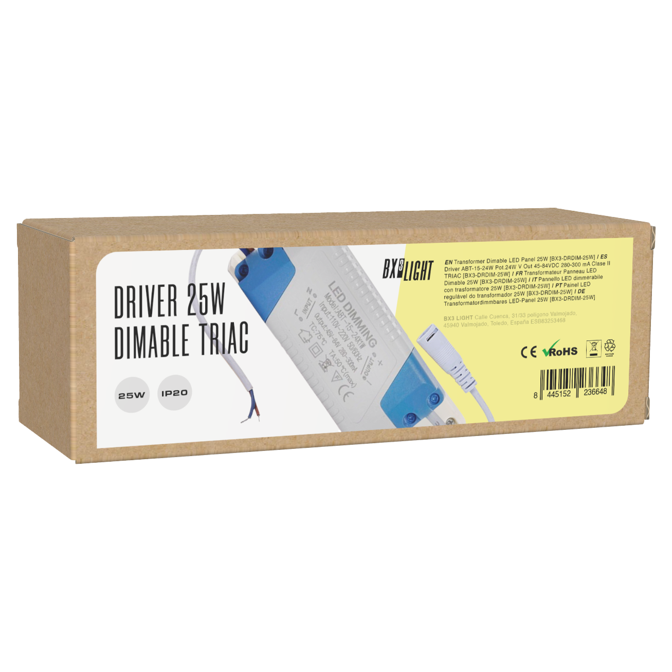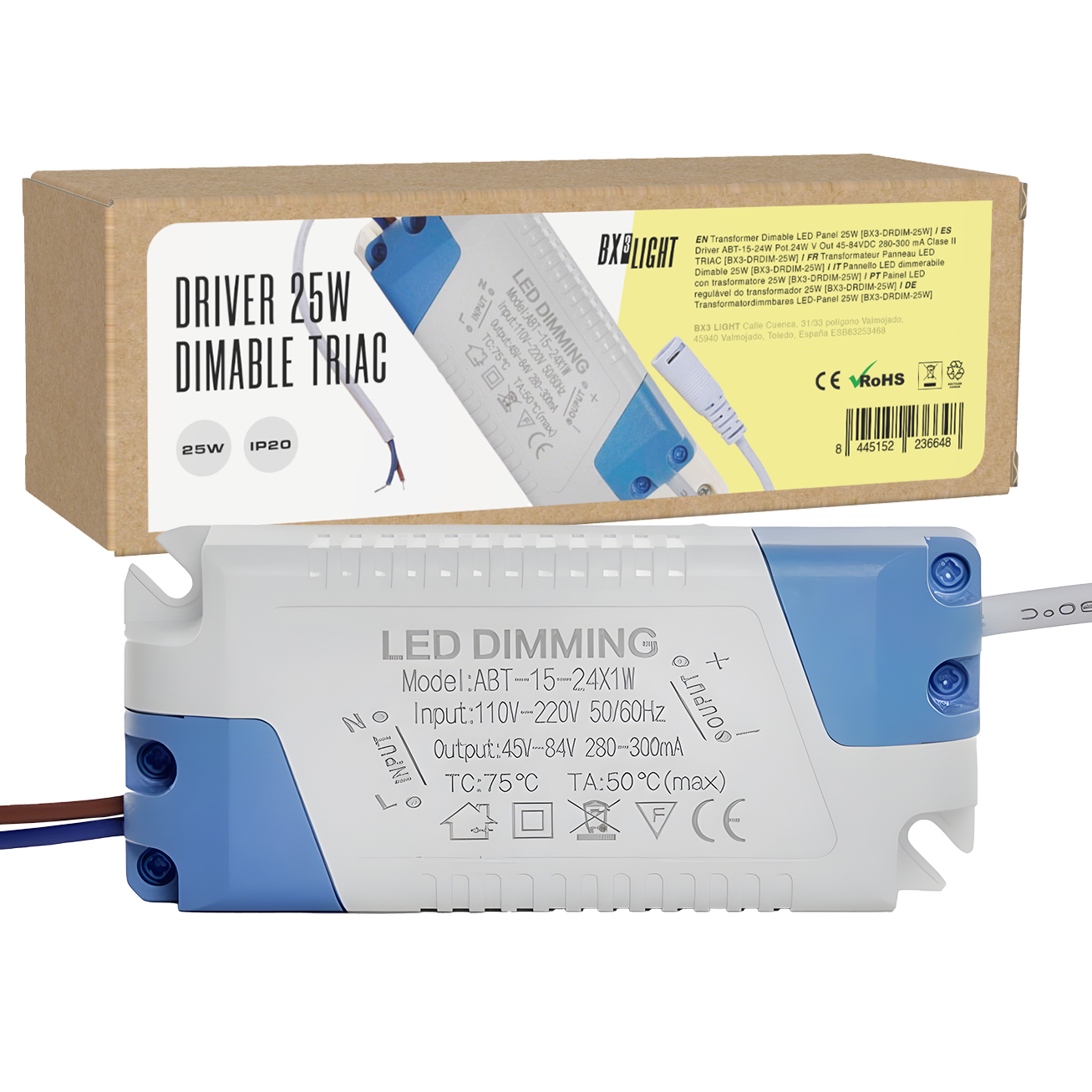 El Driver LED ABT-15-24 W 24 W BX3 LIGHT con regulación TRIAC es una fuente de alimentación de corriente constante diseñada para luminarias LED regulables mediante sistemas de corte de fase (TRIAC), garantizando compatibilidad con reguladores convencionales y estabilidad eléctrica en aplicaciones profesionales. Especificaciones técnicas: Potencia nominal: Hasta 24 W Rango de corriente de salida: 280–300 mA (corriente constante) Rango de tensión de salida: 45–84 V DC Sistema de regulación: TRIAC (leading edge / trailing edge) Clase de protección: Class II (doble aislamiento) Alta eficiencia energética Funcionamiento sin parpadeos (flicker free) Características principales: Compatible con reguladores de pared tipo TRIAC Regulación progresiva y estable de la intensidad lumínica Protección contra sobrecarga, sobretensión y cortocircuito Amplio rango de salida para diferentes configuraciones LED Ideal para downlights, paneles LED y luminarias técnicas en proyectos residenciales y comerciales Fabricado bajo los estándares de calidad de BX3 LIGHT, ofrece rendimiento estable, regulación eficiente y fiabilidad en instalaciones LED con control por corte de fase.