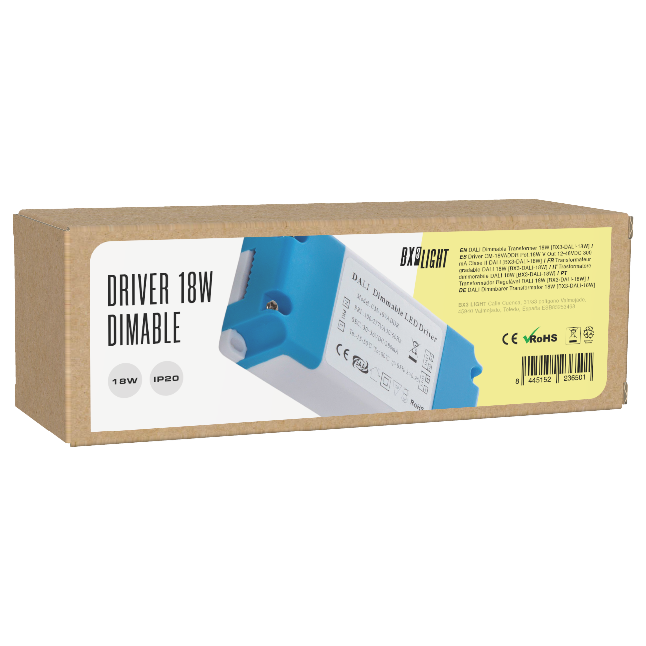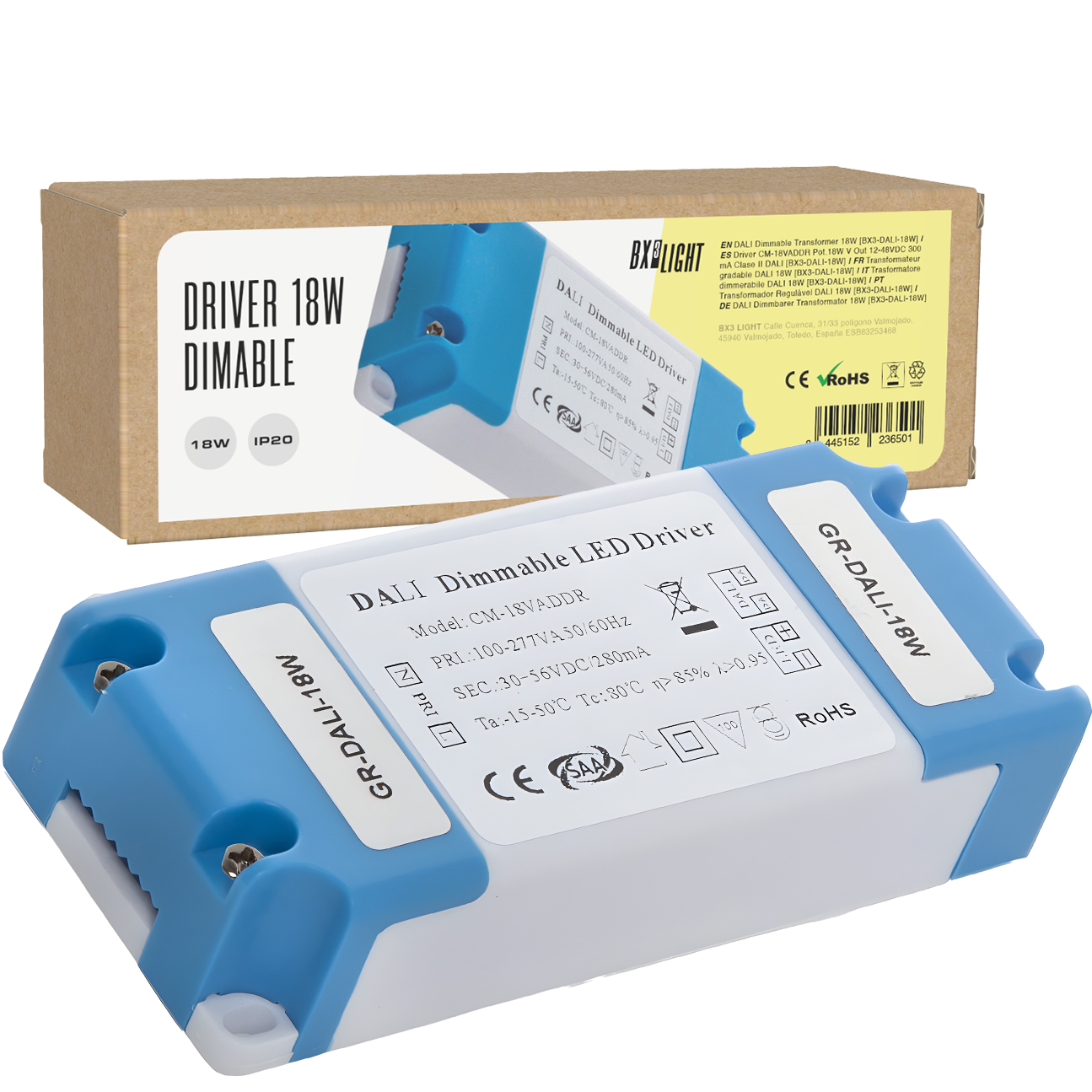 El Driver LED CM-18VADDR 18 W BX3 LIGHT con protocolo DALI es una fuente de alimentación de corriente constante diseñada para sistemas de iluminación LED regulables, ofreciendo control digital preciso y alta estabilidad eléctrica en instalaciones profesionales. Especificaciones técnicas: Potencia nominal: 18 W Corriente de salida: 300 mA (corriente constante) Rango de tensión de salida: 12–48 V DC Protocolo de control: DALI Clase de protección: Clase II (doble aislamiento) Tipo de regulación: Control digital mediante sistema DALI Alta eficiencia energética Características principales: Compatible con sistemas de gestión de iluminación DALI Regulación suave y sin parpadeos (flicker free) Protección contra sobrecarga, sobretensión y cortocircuito Diseño compacto para integración en luminarias técnicas Ideal para oficinas, retail, hoteles y proyectos de iluminación inteligente Fabricado bajo los estándares de calidad de BX3 LIGHT, garantiza rendimiento estable, eficiencia y control avanzado en aplicaciones de iluminación LED profesional.