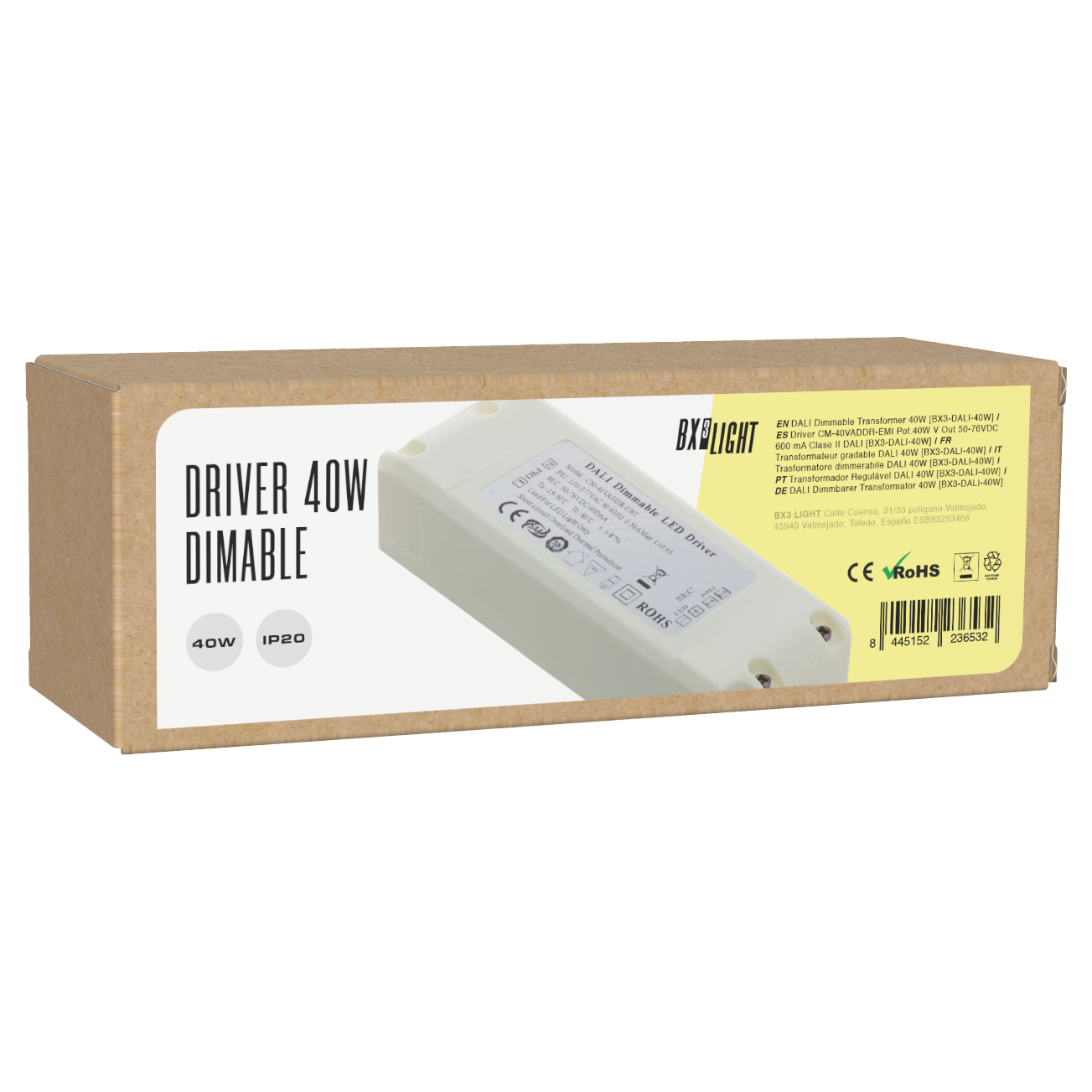 El Driver LED CM-40VADDR-EMI 40 W BX3 LIGHT con protocolo DALI es una fuente de alimentación de corriente constante diseñada para aplicaciones LED profesionales, incorporando filtrado EMI para garantizar estabilidad eléctrica y compatibilidad electromagnética en instalaciones técnicas exigentes. Especificaciones técnicas: Potencia nominal: 40 W Corriente de salida: 600 mA (corriente constante) Rango de tensión de salida: 50–76 V DC Protocolo de control: DALI Clase de protección: Clase II (doble aislamiento) Filtro EMI integrado Alta eficiencia y funcionamiento sin parpadeos (flicker free) Características principales: Compatible con sistemas de gestión y control de iluminación DALI Regulación digital suave y precisa Protección contra sobrecarga, sobretensión y cortocircuito Mejora del rendimiento electromagnético gracias al filtrado EMI Diseñado para luminarias técnicas en oficinas, retail, industria y edificios inteligentes Fabricado bajo los estándares de calidad de BX3 LIGHT, garantiza fiabilidad, seguridad eléctrica y control avanzado en proyectos de iluminación LED regulable de media y alta potencia.