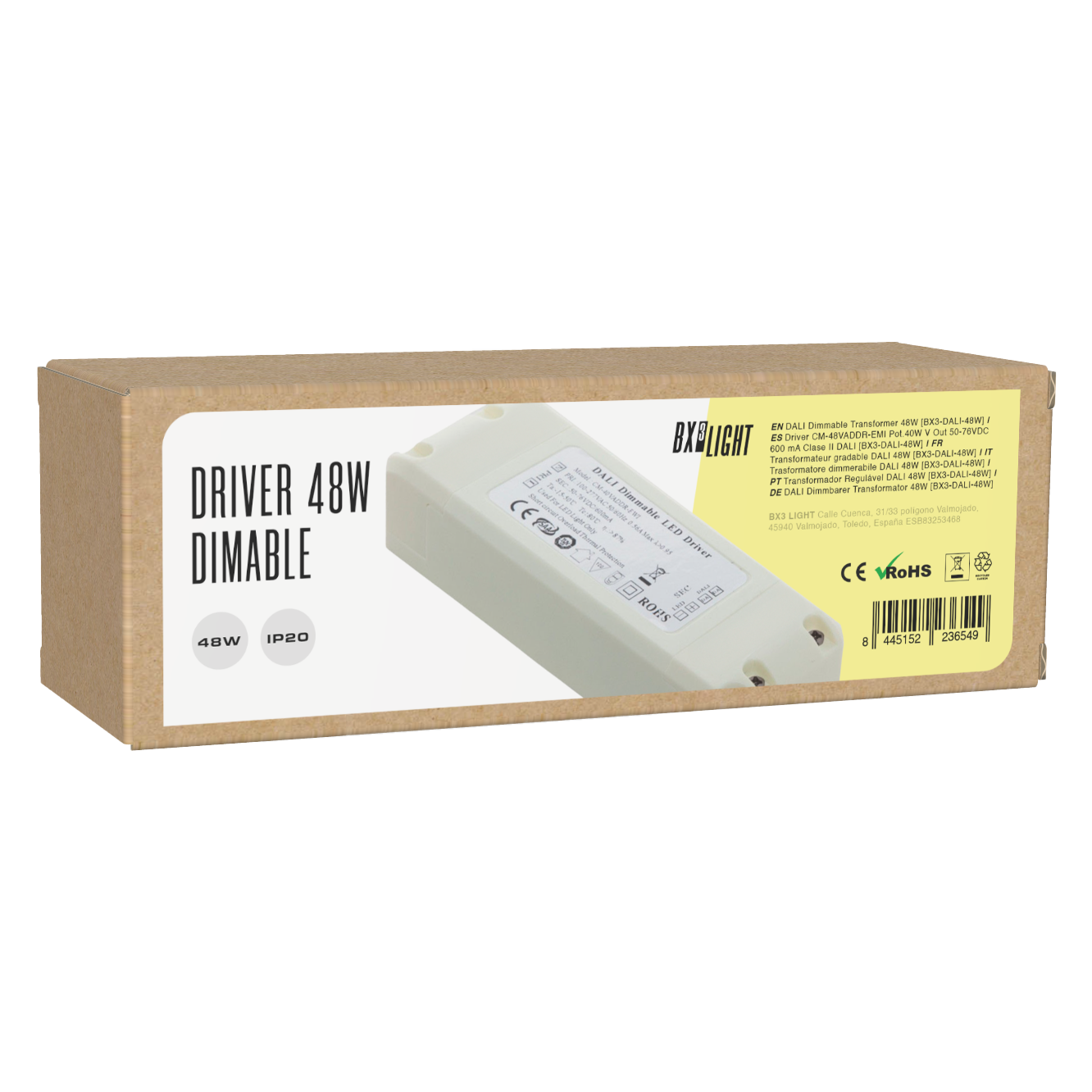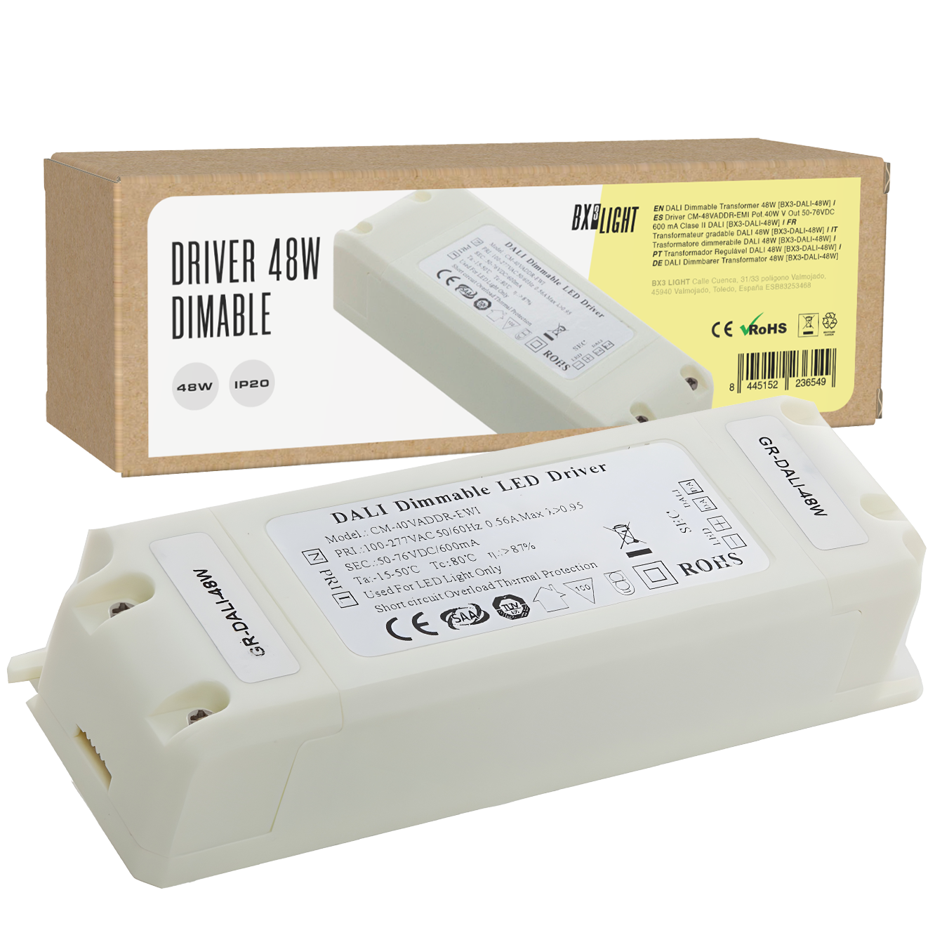 El Driver LED CM-48VADDR-EMI 40 W BX3 LIGHT con protocolo DALI es una fuente de alimentación de corriente constante diseñada para aplicaciones LED profesionales que requieren regulación digital precisa, alta estabilidad eléctrica y compatibilidad electromagnética. Especificaciones técnicas: Potencia nominal: 40 W Corriente de salida: 600 mA (corriente constante) Rango de tensión de salida: 50–76 V DC Protocolo de control: DALI Clase de protección: Class II (doble aislamiento) Filtro EMI integrado Alta eficiencia energética y bajo nivel de parpadeo (flicker free) Características principales: Compatible con sistemas de control y gestión DALI Regulación digital suave y precisa Protección contra sobrecarga, sobretensión y cortocircuito Óptima compatibilidad electromagnética gracias al filtrado EMI Diseñado para luminarias técnicas en oficinas, retail, industria y proyectos arquitectónicos Fabricado bajo los estándares de calidad de BX3 LIGHT, garantiza rendimiento estable, seguridad eléctrica y control avanzado en instalaciones de iluminación LED regulable. Si quieres, puedo prepararte una tabla comparativa técnica completa de todos los drivers DALI BX3 (12 W–48 W) para catálogo profesional o ficha descargable en PDF.