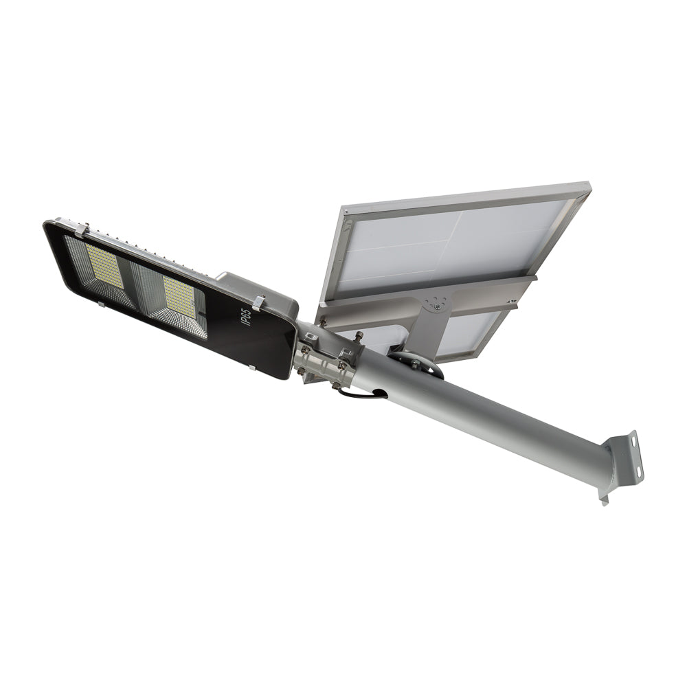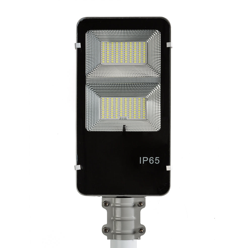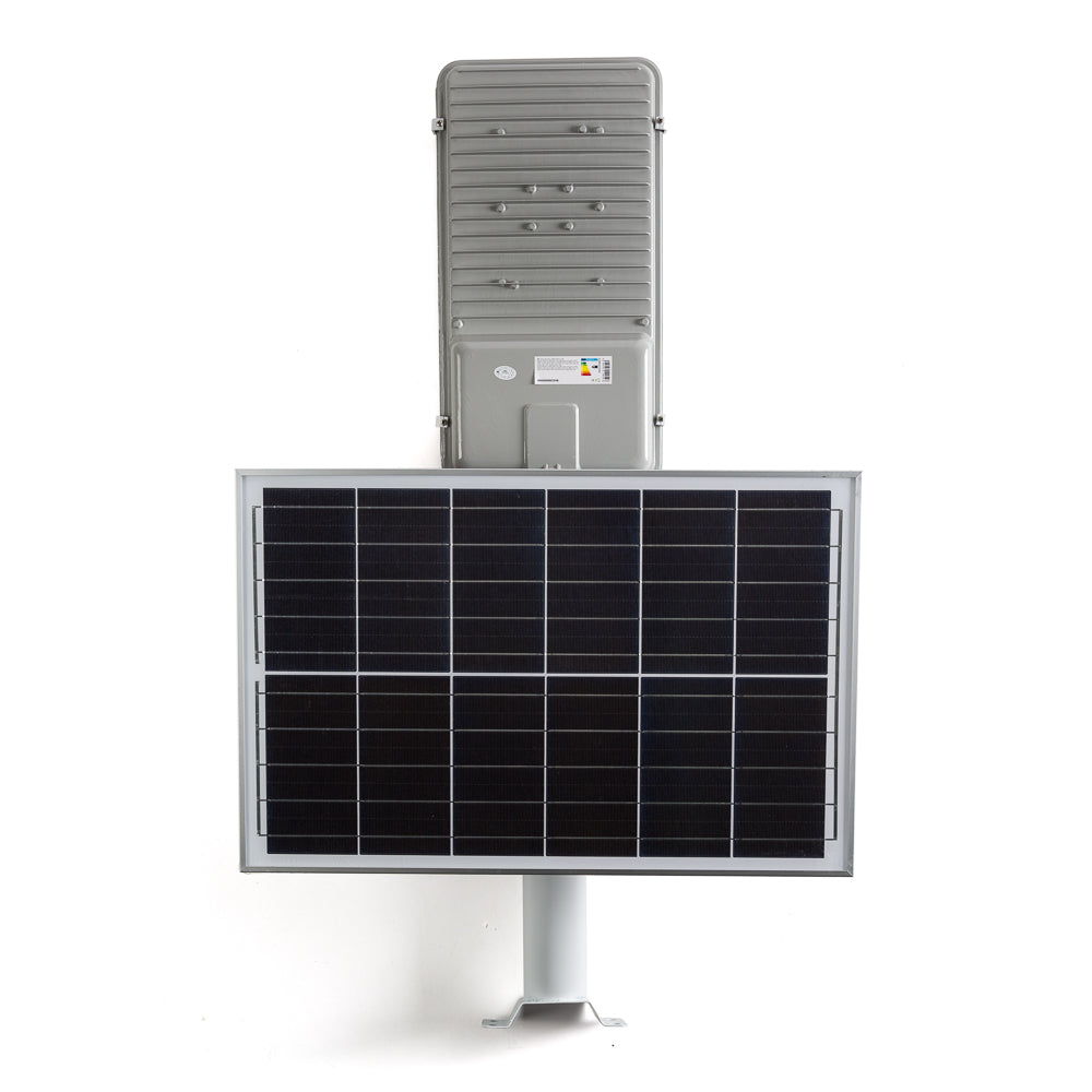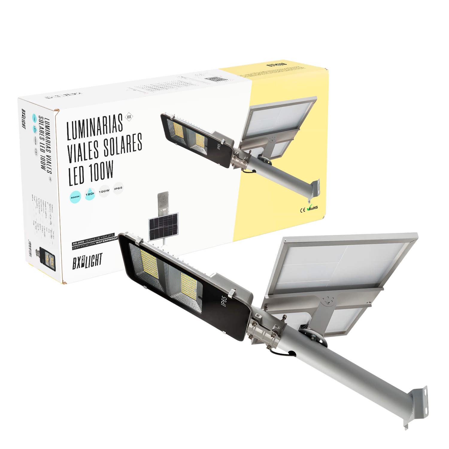 La Farola LED Solar 100 W [BX3-SLABS100W-CW] de BX3 Light es una luminaria exterior autónoma y eficiente diseñada para iluminación urbana y espacios públicos sin necesidad de conexión a la red eléctrica. Su sistema con panel solar integrado y sensor de movimiento proporciona un funcionamiento completamente independiente, ideal para zonas donde la instalación eléctrica convencional es difícil o costosa. Características técnicas principales Potencia nominal: 100 W LED Flujo luminoso: 5.000 Lm Temperatura de color: 6.000 ºK (luz blanco frío) Alimentación: Panel solar integrado (alta eficiencia) Sensor: Sensor de movimiento / Sensor crepuscular para activación automática Grado de protección: IP65 – resistente a polvo, lluvia y condiciones exteriores Vida útil de los LEDs: ≈ 40.000 h Diseño: Cuerpo robusto de aluminio con óptica eficiente Instalación: Poste o soporte para farola urbana Sistema solar y autonomíaLa farola está equipada con un panel solar de alta eficiencia que convierte la energía solar en electricidad para alimentar la luminaria LED y cargar su batería interna. Esto permite: Operación autónoma sin necesidad de cableado eléctrico.