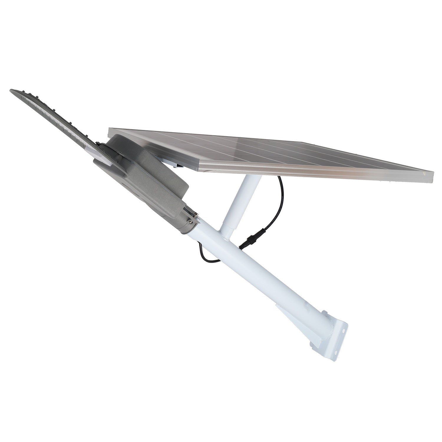 Farola solar LED de alta potencia diseñada para iluminación exterior profesional, con funcionamiento totalmente autónomo gracias a su panel solar de alto rendimiento y batería de gran capacidad. Incorpora sistema de control inteligente con sensor crepuscular y mando a distancia, ideal para zonas públicas y privadas sin acceso a red eléctrica. Características técnicas Potencia LED: 300 W Temperatura de color: 5000 K (luz blanca neutra/fría) Flujo luminoso estimado: hasta 30 000 lm Eficiencia luminosa: >100 lm/W Tipo de LED: SMD de alta eficiencia Sistema solar integrado Panel solar: Policristalino 6 V / 30 W Batería: Litio / Gel 28 Ah (según versión) Autonomía: Hasta 12–14 horas de funcionamiento Tiempo de carga: 6–8 horas con radiación solar directa Control y sensores Sensor crepuscular (LUX): encendido automático al anochecer y apagado al amanecer Control remoto multifunción: Encendido / apagado manual Selección de modos de trabajo Regulación de intensidad luminosa Programación por temporizador Modos de funcionamiento: Automático, Potencia total, Ahorro energético, Temporizado Diseño y construcción Grado de protección: IP65 – resistente al agua y polvo Material del cuerpo: Aluminio de alta resistencia Difusor: Policarbonato óptico Color: Negro Vida útil del LED: > 30 000 horas Temperatura de trabajo: –20 °C a +60 °C Montaje: En poste o pared (compatible con tubo Ø48–60 mm, según soporte) Instalación Instalación rápida y sencilla No requiere cableado eléctrico Incluye soportes y accesorios de fijación Bajo mantenimiento Aplicaciones recomendadas Alumbrado público y vial secundario Calles y caminos rurales Aparcamientos y áreas industriales Parques, plazas y urbanizaciones Entradas, fincas y perímetros exteriores Ventajas destacadas Alta potencia lumínica con bajo consumo Funcionamiento 100 % solar y ecológico Encendido automático inteligente Control total mediante mando a distancia Ideal para zonas sin suministro eléctrico