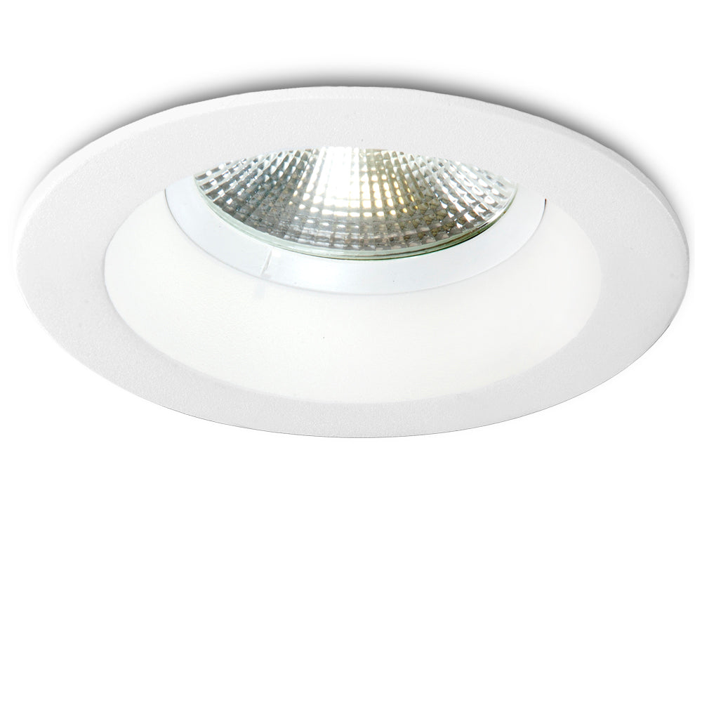 Acabado en blanco construido con aluminio y policarbonato. El Downlight tiene un grado de protección IP20 (válido para polvo y humedad en interiores), además de ser lo suficientemente robusto para las exigencias mecánicas requeridas. Está fabricado con materiales de alta calidad como el aluminio, lo que garantiza la durabilidad del foco. Ofrece una iluminación uniforme sin reflejos molestos.