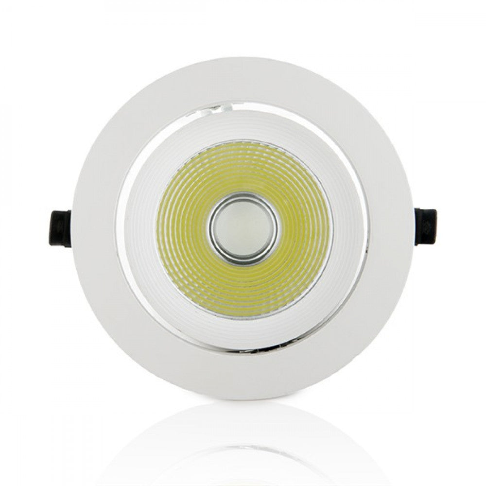 El Foco Downlight de LEDs COB Circular Orientable permite una distribución de la luz con unas propiedades excelentes. Este foco es comparable a los focos halógenos tradicionales de hasta 200 W, contando con un consumo de energía ultra-bajo, unas propiedades ópticas y de seguridad óptimas y una vida extra-larga. Cuerpo basculante que permite la opción de iluminar planos verticales y la acentuación de objetos. Su vida útil se estima en 40.000 horas, por tanto, tiene una vida útil 10 veces más larga que un foco convencional.