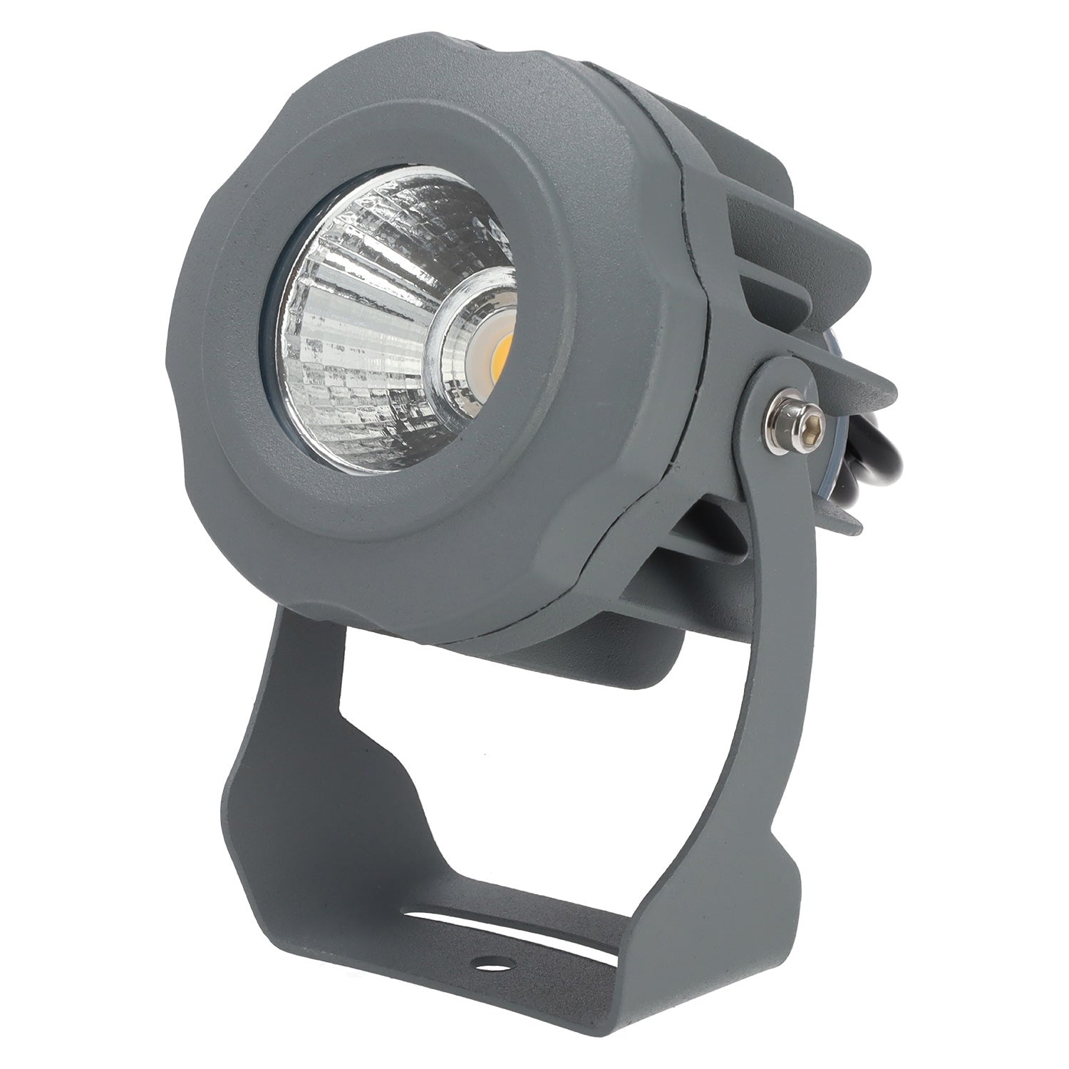 Foco LED de exterior diseñado para la iluminación decorativa y funcional de jardines, zonas ajardinadas, senderos, fachadas y elementos paisajísticos. Incorpora pincho de fijación que permite una instalación rápida y segura directamente en el suelo, facilitando la orientación del haz de luz según las necesidades del espacio. Fabricado en materiales resistentes para uso exterior, cuenta con un grado de protección IP65 que garantiza protección frente al polvo y chorros de agua, asegurando un funcionamiento fiable en condiciones climatológicas adversas.