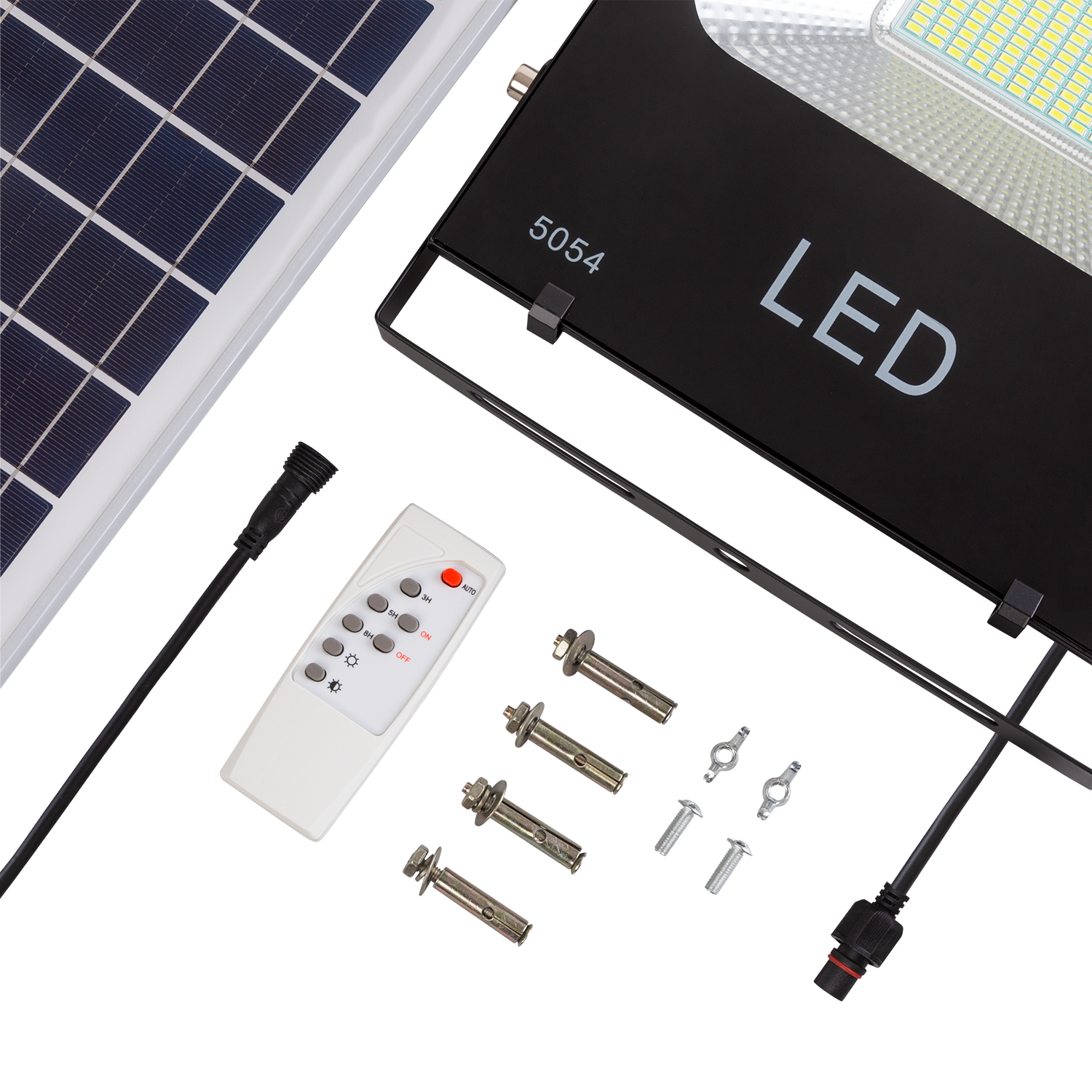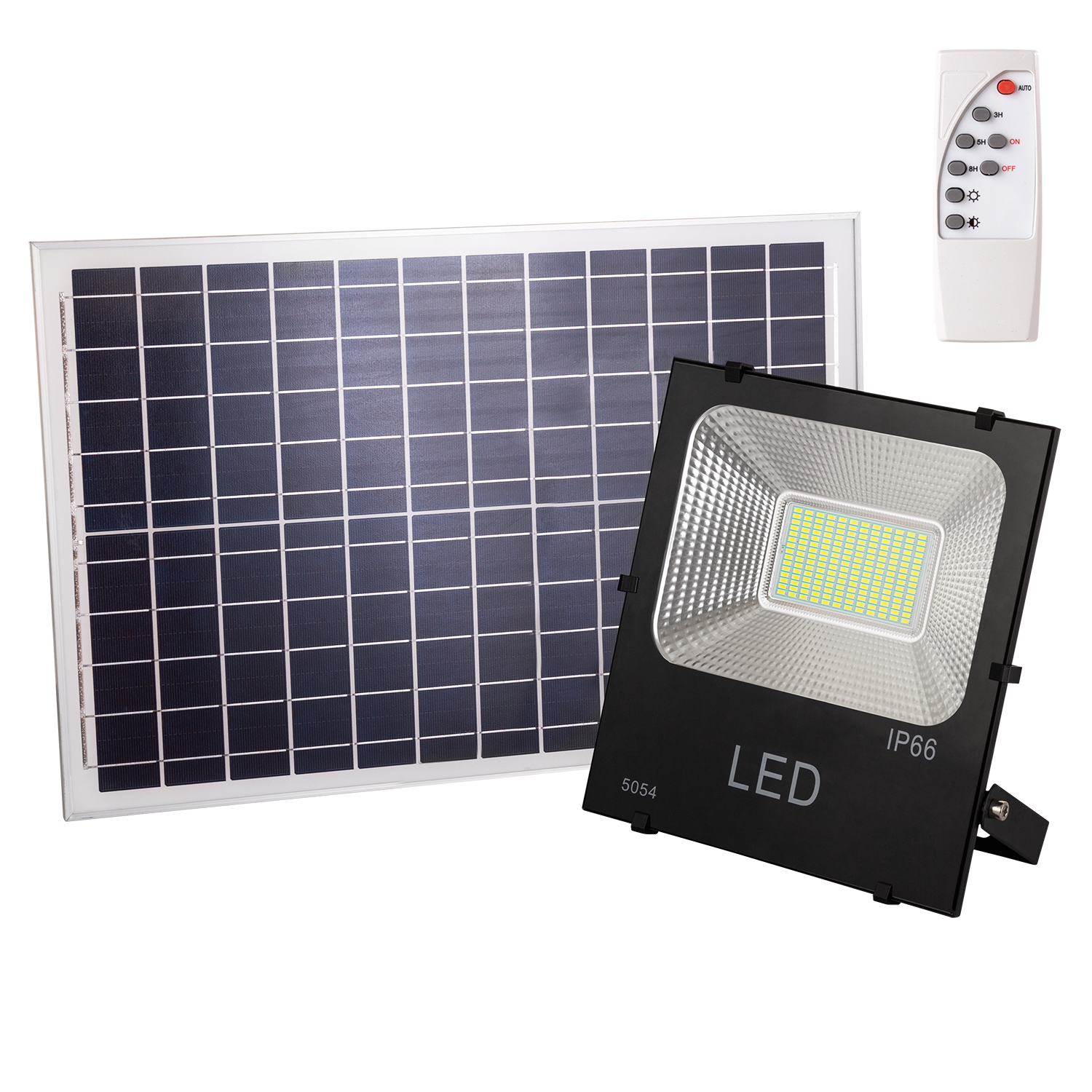Kit que incluye proyector solar LED con batería de litio integrada de alta potencia, panel solar, mando a distancia y herrajes para su instalación. Incorpora sensores de luminosidad. Ideal para iluminar de manera automatizada y sin necesidad de corriente eléctrica cualquier zona de exterior. Funcionamiento: Puede utilizar el proyector LED conectado al panel solar o de forma independiente, en este último caso no funciona en modo automático, y se apaga o enciende desde el mando a distancia.