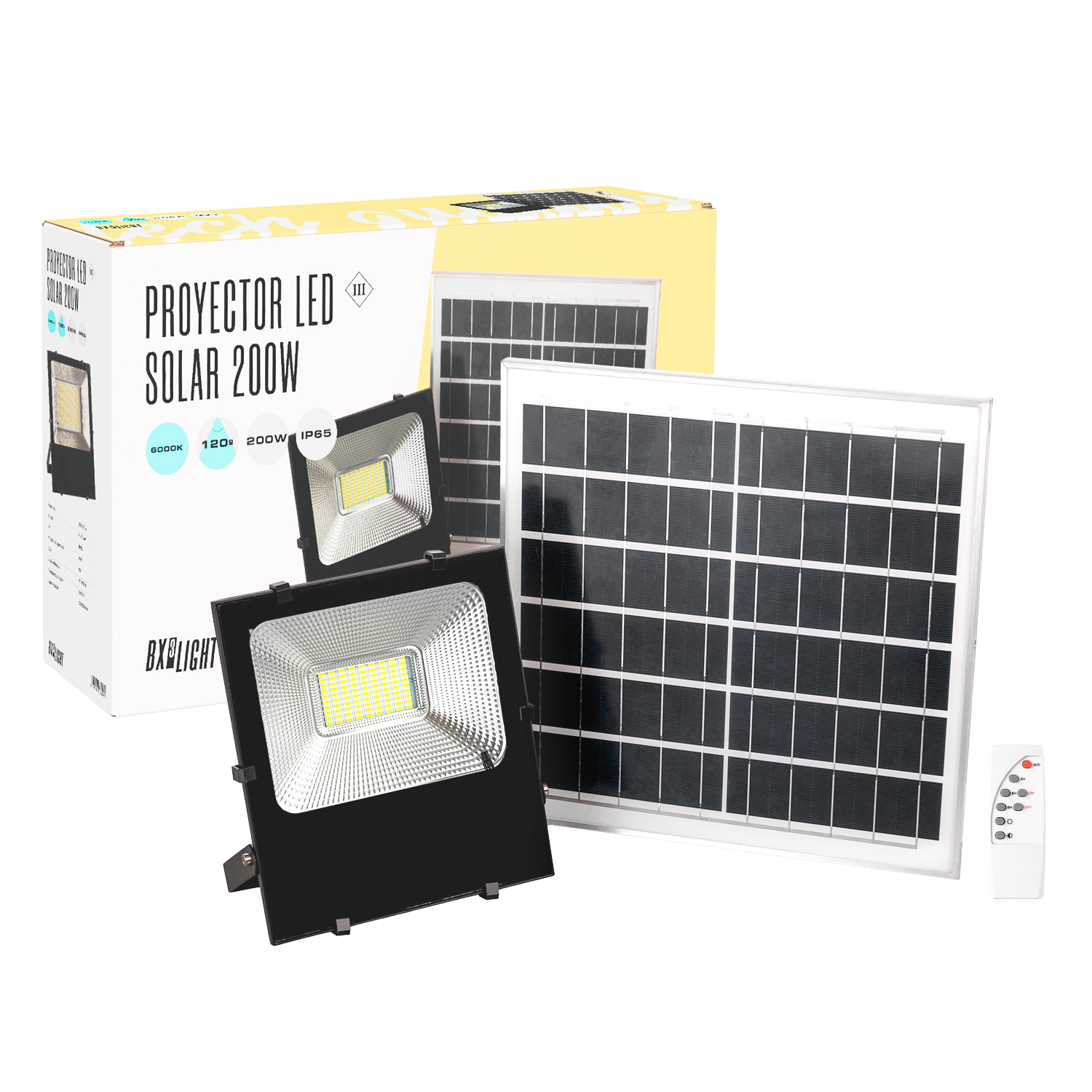 El Proyector LED Solar 200 W [BX3-626006-CW] de BX3 Light es una solución de iluminación autónoma y versátil, diseñada para proporcionar un potente haz de luz exterior sin necesidad de conexión a la red eléctrica. Integrando un sistema solar con panel de 30 W (6 V), detector de movimiento y control remoto, combina eficiencia energética, independencia y facilidad de uso. Características técnicas principales Potencia nominal: 200 W LED Flujo luminoso: 20.000 Lm Temperatura de color: 6.000 ºK (blanco frío) Sistema de alimentación: Panel solar 6 V / 30 W incluido Sensor solar: Carga automática del panel durante el día Control remoto: Permite configurar modos, temporizadores y sensibilidad del sensor sin necesidad de acceso directo al proyector Detección de movimiento: Automaticidad para activación por proximidad y ahorro energético Grado de protección: IP66 – resistencia frente a agua y polvo, apto para uso exterior Vida útil estimada: 40.000 h Instalación: Soporte regulable para orientación óptima del haz de luz Diseño y prestaciones Alimentación solar independiente: El panel solar de 30 W (6 V) permite una carga eficiente durante todo el día para suministro autónomo por la noche sin necesidad de cableado eléctrico. Sensor de movimiento integrado: Optimiza el uso energético encendiendo el proyector solo cuando se detecta actividad, ideal para seguridad e iluminación puntual.