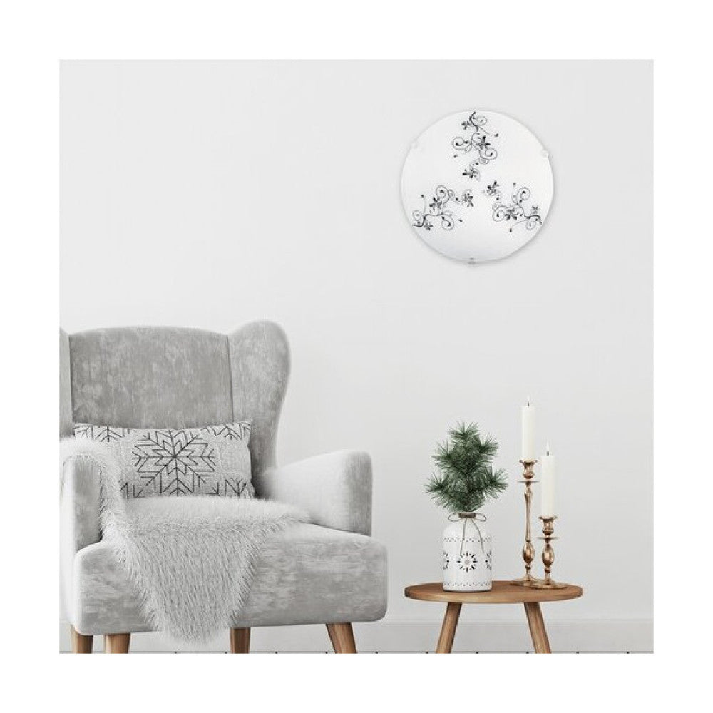 Lámpara de techo de 25 cm de diámetro de estilo romántico. Tiene una estructura de metal y plástico con tulipa de cristal blanco y traslúcido. También se puede utilizar con una fuente de luz halógena o LED de hasta 60 W, con casquillo E27.
