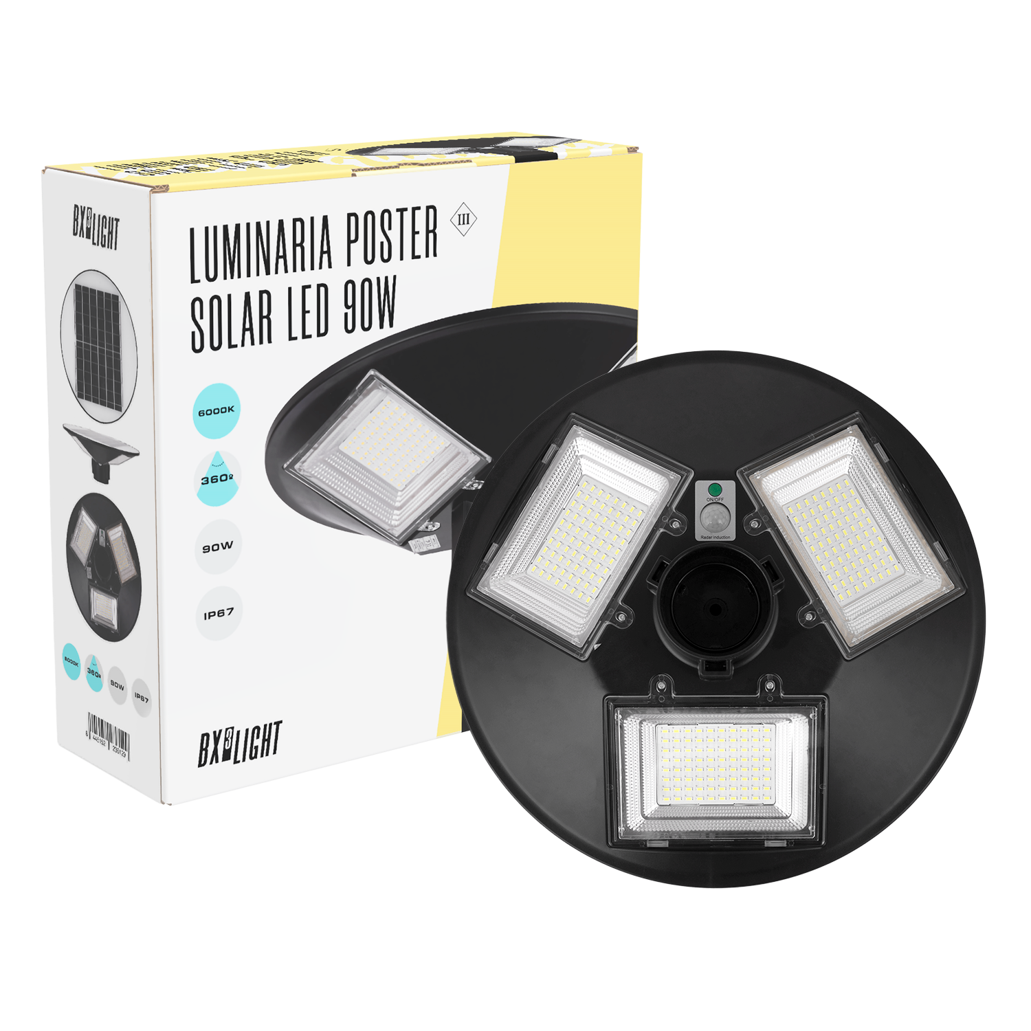La Luminaria Poster Solar LED 90 W BX3 LIGHT es una solución de alumbrado exterior autónoma diseñada para montaje en poste, ofreciendo alto rendimiento lumínico, eficiencia energética y máxima resistencia en entornos urbanos y residenciales. Equipada con sistema solar integrado, permite funcionamiento independiente sin necesidad de conexión a red eléctrica. Especificaciones técnicas: Potencia nominal: 90 W Temperatura de color: 6000K (blanco frío) Alimentación: Panel solar integrado Grado de protección: IP67 (protección total contra polvo e inmersión temporal) Tecnología LED: Alta eficiencia Encendido automático: Sensor crepuscular (según modelo) Batería recargable integrada Larga vida útil operativa Características principales: Funcionamiento 100% autónomo Iluminación clara y potente para exteriores Alta resistencia a condiciones climáticas adversas Fácil instalación sin cableado Ideal para parques, calles, urbanizaciones, caminos y zonas sin acceso a red eléctrica Fabricada bajo los estándares de calidad de BX3 LIGHT, garantiza fiabilidad, eficiencia energética y durabilidad en proyectos de alumbrado público solar.