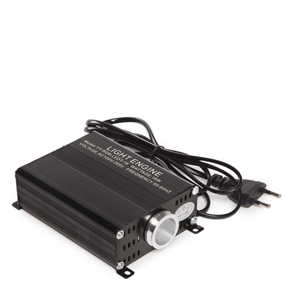 La fuente de luz LED (iluminador) es el único componente que precisa alimentación eléctrica y puede ser ocultado en cualquier parte segura. Los cables de fibra óptica estan aislados, son seguros, se pueden instalar en exteriores, zonas inflamables, y no generan calor por iluminación. Ideal para iluminación y decoración, iluminación de interiores, confeccionar techos estrellados, iluminación de jardines, rótulos comerciales, etc. Componentes del Kit: LED RGB de 16 W con control remoto por radiofrecuencia.