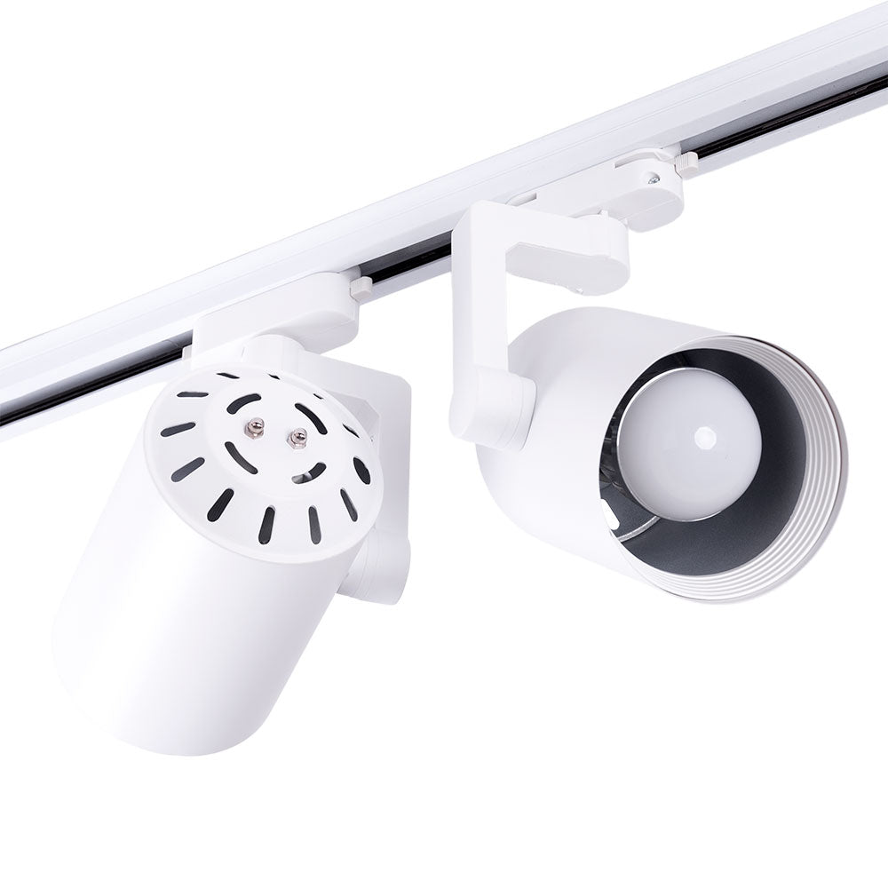 El Pack 2 Foco de Carril Monofásico E27 PAR30/A65 es la solución perfecta para destacar un elemento concreto en el espacio. El Portalámparas de Carril Monofásico para Bombilla E27 es totalmente orientable, lo que permite que la luz del foco pueda ser dirigida en cualquier dirección. Esto hace posible modificar la iluminación del espacio en función de los elementos que lo componen.