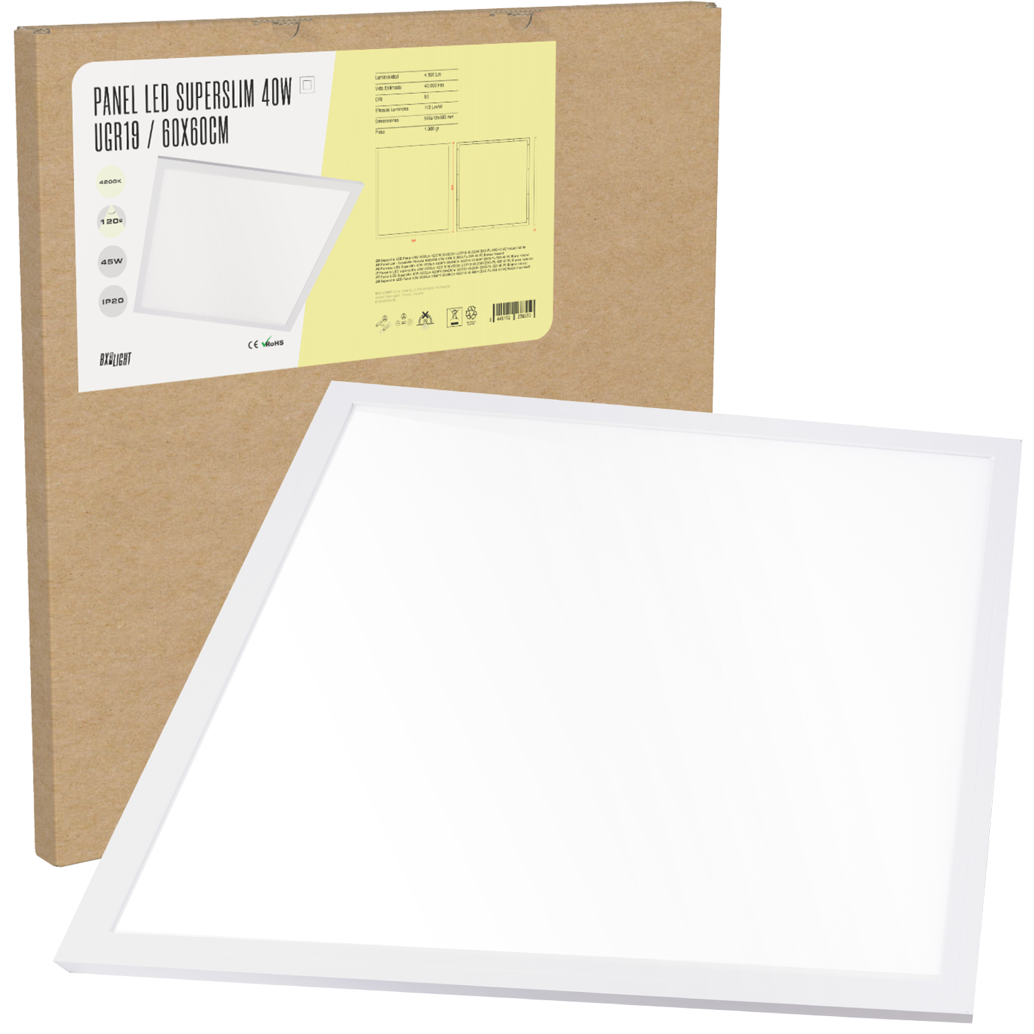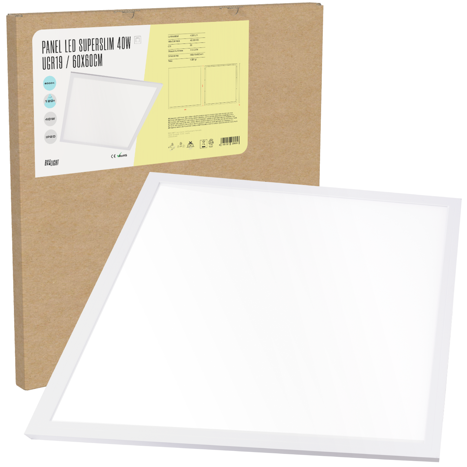 El Panel LED Superslim 40 W [BX3-595-40-CW] de BX3 Light es una luminaria de techo ultra delgada diseñada para proporcionar iluminación uniforme, potente y confortable en instalaciones interiores, con un índice de deslumbramiento UGR < 19 que lo hace ideal para espacios de trabajo y áreas donde se desea una luz eficiente con bajo impacto visual. Características técnicas principales Potencia nominal: 40 W Flujo luminoso: 4.500 Lm Temperatura de color: 6.000 ºK (blanco frío) Dimensiones: 600 × 600 mm (panel estándar para falso techo) Índice de deslumbramiento: UGR < 19 – óptica diseñada para reducir reflejos molestos Altura del panel: Superslim (perfil ultra delgado) Vida útil estimada: 40.000 h Tecnología LED: Chips de alta eficiencia Instalación: Empotrable o en superficie (según accesorio) Distribución lumínica: Homogénea y sin zonas oscuras Ventajas del diseño UGR < 19: proporciona confort visual en ambientes de trabajo, oficinas y salas de reunión. Perfil Superslim: diseño moderno y discreto que se integra perfectamente en techos con placas de 600×600 mm.