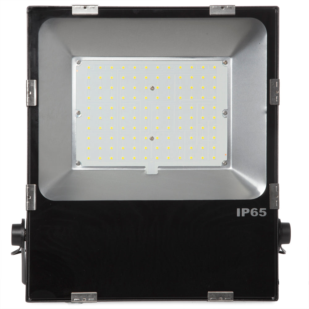 Proyector LED Slimline Lumileds LED 3030 100 W 12000 Lm IP65 50000 H integra potentes LEDs Luxeon 3030 2D, que tienen un rendimiento de 120 lm/W. La luz que emite es de alta calidad, como muestra su elevado CRI, y se distribuye en un ángulo de 120º de apertura. Su carcasa está fabricada en aluminio y mantiene al equipo en una temperatura óptima de trabajo. Destaca por su fuente de alimentación de estado sólido.