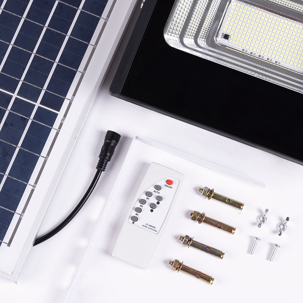 Kit que incluye proyector solar LED con batería de litio integrada de alta potencia, panel solar, mando a distancia y herrajes para su instalación. Incorpora sensores de luminosidad. Ideal para iluminar de manera automatizada y sin necesidad de corriente eléctrica cualquier zona de exterior. Funcionamiento: Puede utilizar el proyector LED conectado al panel solar o de forma independiente, en este último caso no funciona en modo automático, y se apaga o enciende desde el mando a distancia.