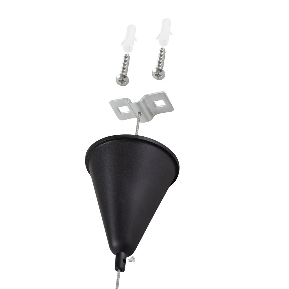 El Kit de Suspensión para Carril Trifásico permite instalar los carriles a cierta distancia del techo. Cada Kit está compuesto por un cable de acero de 1metro de longitud, un enganche de carril y un enganche de techo. Con estos kits se pueden mantener los sistemas de carriles en suspensión, a una altura regulable.