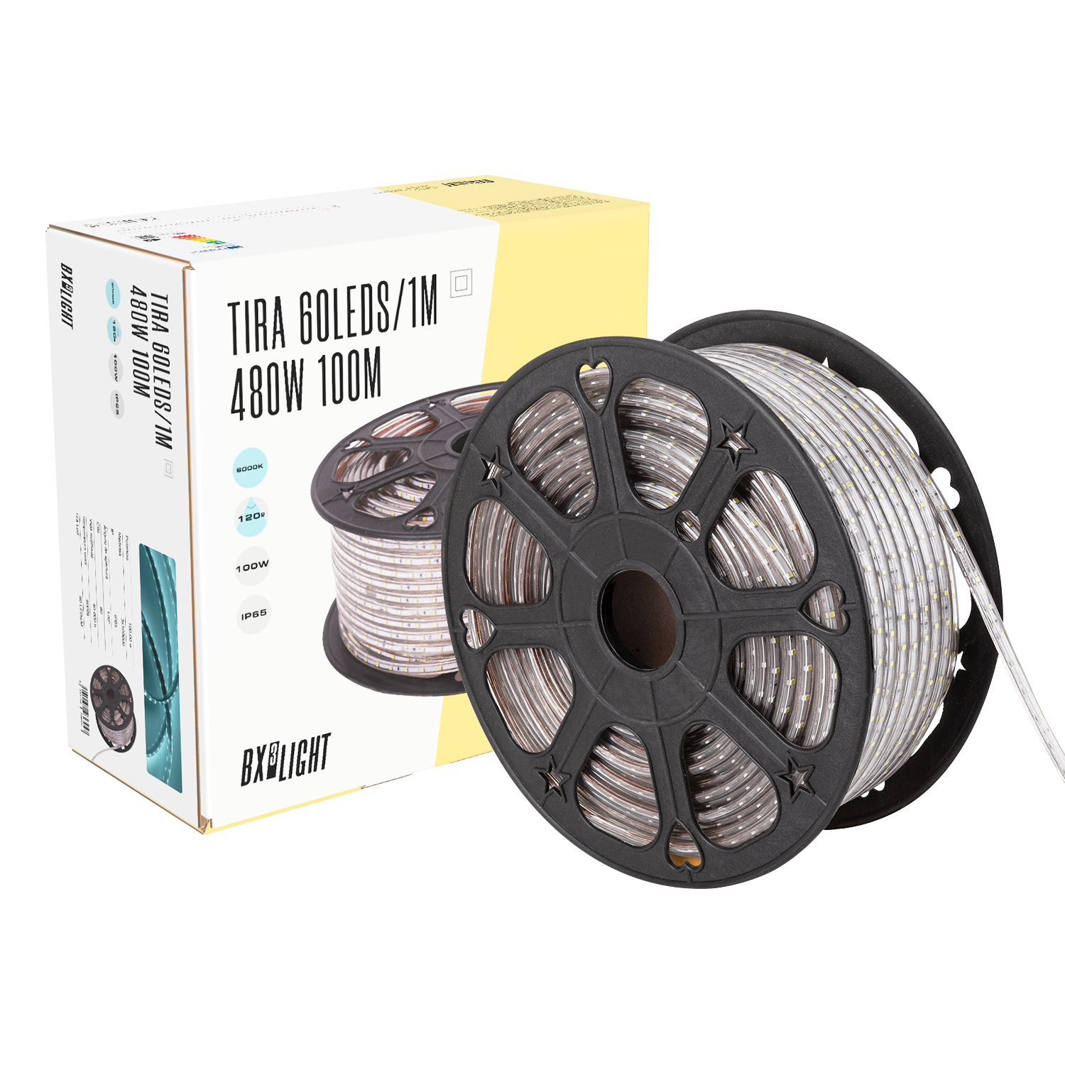La Tira de LEDs 60 LEDs/m 480 W [BX3-2203528-60100MCW] de BX3 Light es una solución LED de alto rendimiento y resistencia, ideal para proyectos de iluminación continua en exteriores e interiores donde se requiera gran longitud de iluminación, alta robustez y operación directa a red eléctrica 220 VAC. Diseñada con chips SMD3528 de alta eficiencia y una construcción robusta con grado de protección IP65, esta tira LED ofrece un equilibrio entre potencia, luminosidad y resistencia a condiciones ambientales no extremas. Características técnicas Modelo: BX3-2203528-60100MCW Potencia total: 480 W Tensión de alimentación: 220 VAC (conexión directa a red) Densidad de LEDs: 60 LEDs por metro Tipo de LED: SMD3528 Longitud: 100 metros continuos Flujo luminoso total: 24.000 lm Temperatura de color: 6.000 ºK (blanco frío) Índice de protección: IP65 – protección contra polvo y chorros de agua (no sumergible) Vida útil estimada: 40.000 h Fácil instalación: compatible con clips, perfiles y accesorios de fijación Diseño y prestacionesEsta tira LED está concebida para operar directamente a 220 VAC, evitando la necesidad de transformadores externos y facilitando su instalación en aplicaciones de larga trayectoria.