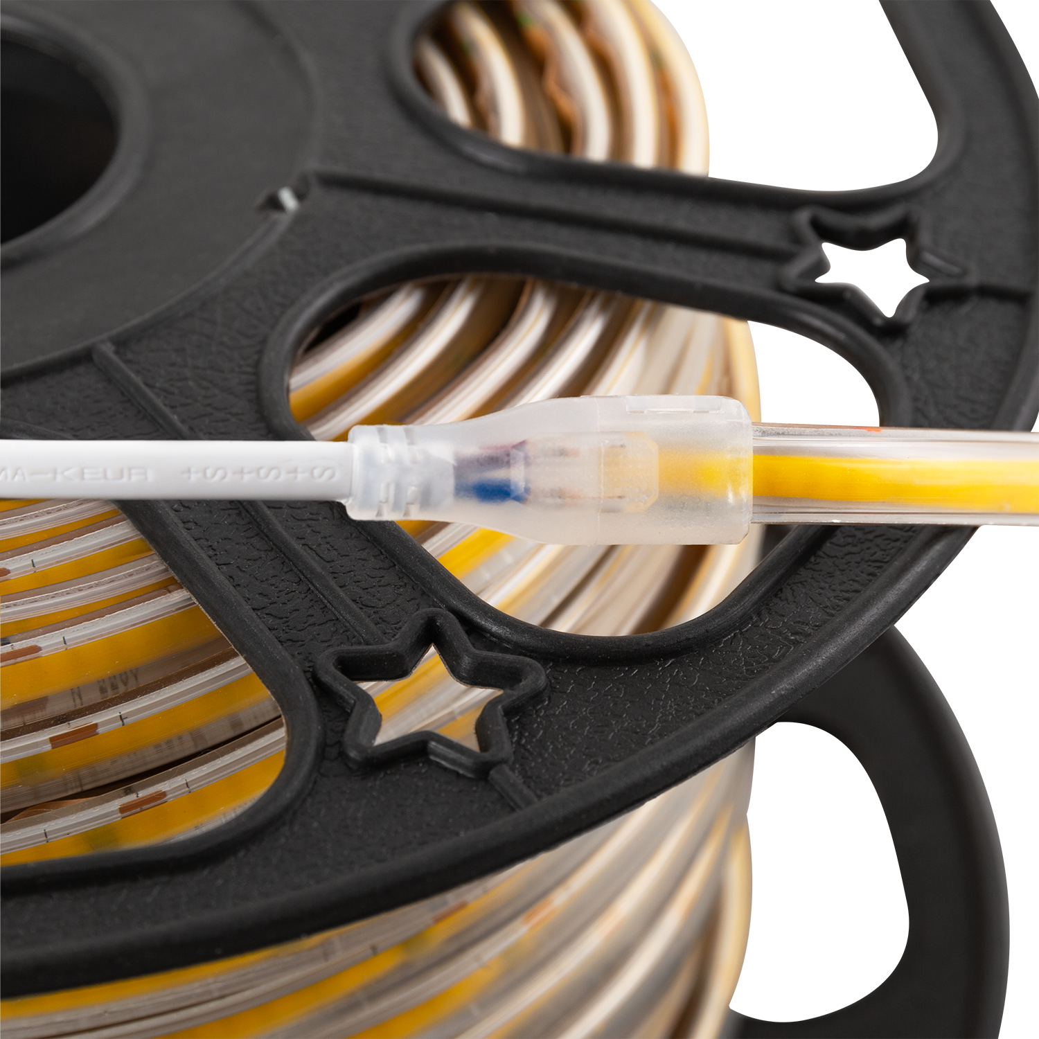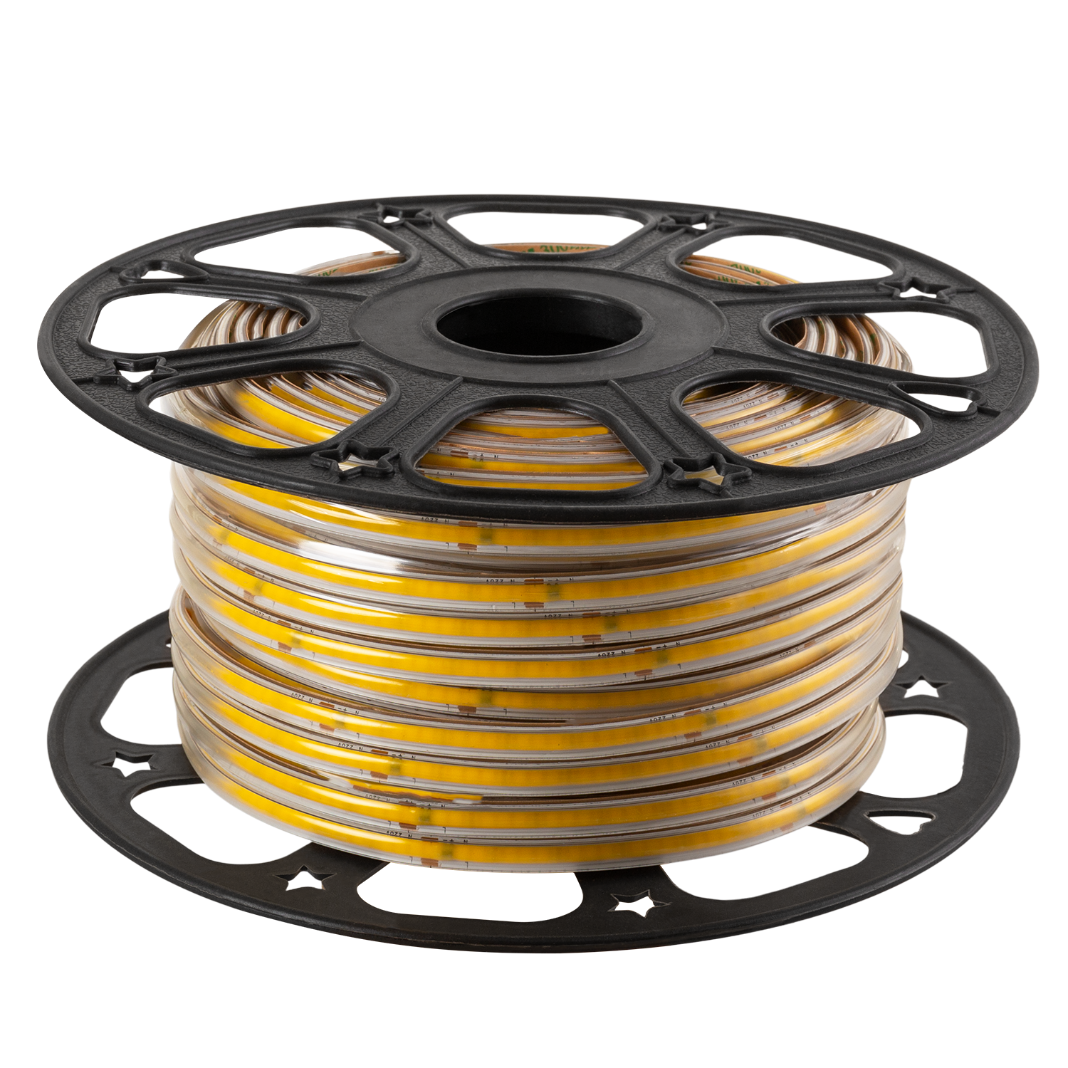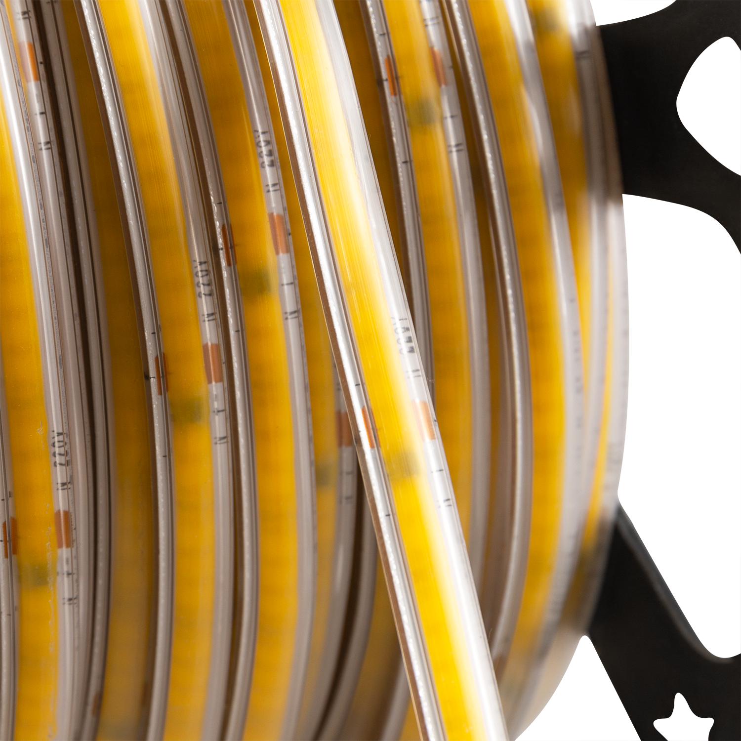 La Bobina Tira LED Regulable Autorectificada 220 V AC COB no requiere ningún tipo de fuente de alimentación pues se conecta directamente a la red eléctrica. Su flexibilidad permite que se adapte a casi cualquier superficie. Esta bobina integra LEDs de tecnología COB de gran eficiencia, haciendo que la luz se reparta uniformemente y consiguiendo un mayor rendimiento en lm/W para la misma potencia que con LEDs SMD tradicionales. Por ello, esta consume tan solo 8 W por metro.