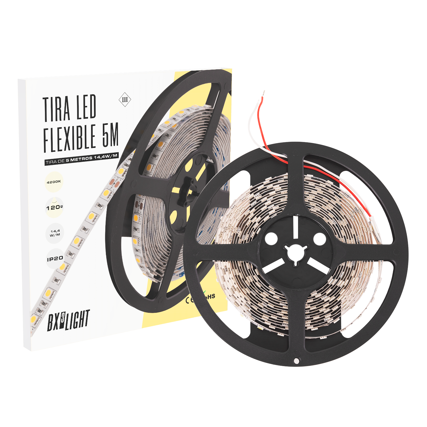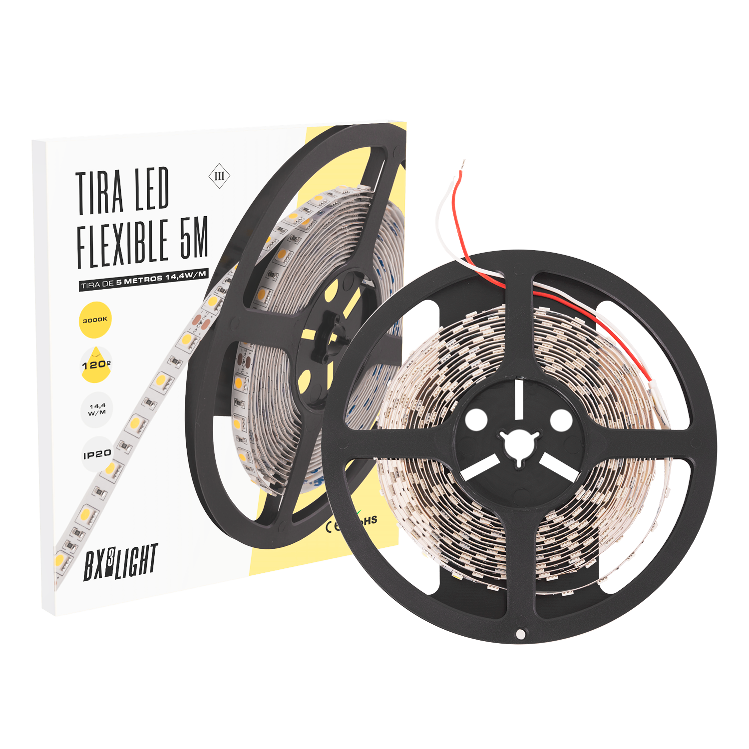 La Tira LED 300 SMD5050 14,4 W/m 24 VDC BX3 LIGHT es una solución de iluminación flexible de alto rendimiento, diseñada para aplicaciones decorativas y técnicas en interiores. Compuesta por 300 chips SMD5050 en 5 metros (60 LED/m), ofrece una iluminación potente y uniforme con excelente eficiencia energética. Especificaciones técnicas: Tipo de LED: SMD5050 Cantidad de LED: 300 LED (60 LED/m) Potencia: 14,4 W por metro Tensión de funcionamiento: 24 V DC Longitud del rollo: 5 metros Grado de protección: IP20 (uso interior) Tipo de instalación: Adhesiva (según modelo) Corte: Seccionable por tramos (según puntos marcados) Características principales: Iluminación intensa y homogénea Mayor estabilidad en 24 V (menor caída de tensión) Ideal para iluminación indirecta y decorativa Bajo consumo energético Compatible con perfiles de aluminio Perfecta para mobiliario, techos, estanterías, escaparates y proyectos arquitectónicos Fabricada bajo los estándares de calidad de BX3 LIGHT, garantiza estabilidad lumínica, eficiencia energética y larga durabilidad en aplicaciones de iluminación interior profesional.