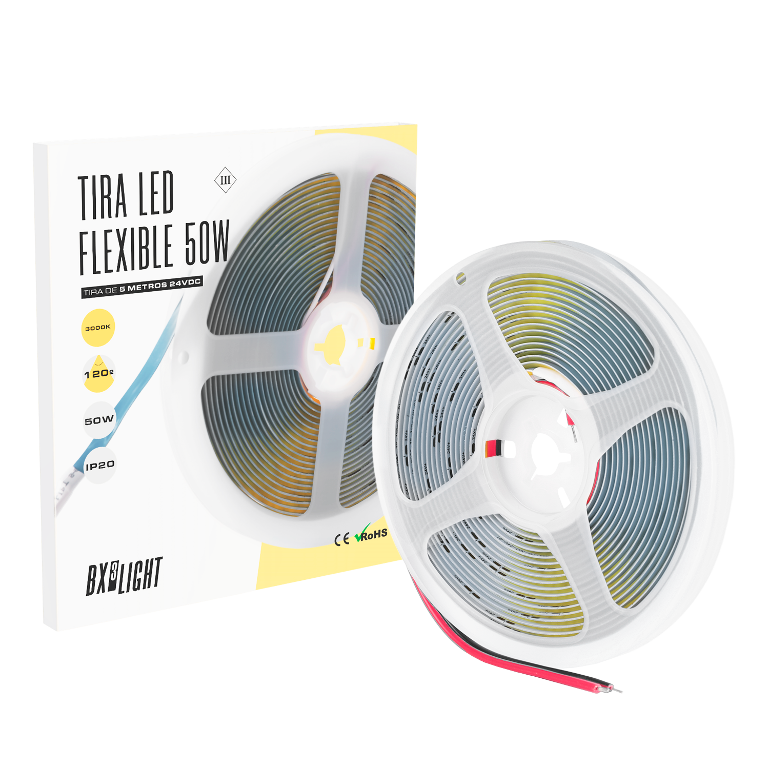 La Tira LED Flexible 50 W 24 VDC BX3 LIGHT es una solución de iluminación interior de alto rendimiento, diseñada para ofrecer mayor estabilidad eléctrica y menor caída de tensión en instalaciones lineales de mayor longitud. Especificaciones técnicas: Potencia total: 50 W (rollo de 5 metros) Tensión de alimentación: 24 V DC Grado de protección: IP20 (uso exclusivo en interior) Longitud: 5 metros Tecnología LED: SMD de alta eficiencia Formato: Flexible y adaptable a superficies rectas o curvas Vida útil estimada: Hasta 40.000 horas (según condiciones de uso) Características principales: Mayor estabilidad frente a caídas de tensión respecto a 12 V Instalación sencilla mediante adhesivo posterior Corte en puntos señalizados para ajuste de longitud Iluminación uniforme y continua Ideal para iluminación indirecta, mobiliario, falsos techos, escaparates y proyectos decorativos profesionales Fabricada bajo los estándares de calidad de BX3 LIGHT, garantiza eficiencia energética, fiabilidad y rendimiento constante en aplicaciones de iluminación técnica y decorativa.