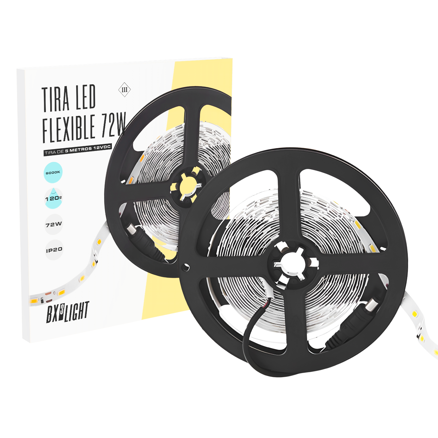La Tira led Flexible 72 W 6000K 12 VDC 5 m de BX3 Light es una solución de iluminación LED lineal flexible diseñada para aplicaciones interiores que requieren alta potencia lumínica y eficiencia energética en espacios continuos o decorativos. Características técnicas Potencia nominal: 72 W Flujo luminoso: aprox. 3.780 lm (flujo total del rollo) Temperatura de color: 6.000 K (blanco frío) Tensión de alimentación: 12 V DC Índice de protección: IP20 (ambientes interiores) Largo: 5 m Tipo de LED: SMD5050, ángulo de apertura ~120° Vida útil estimada: 40.000 h Diseño y prestacionesEsta tira LED flexible combina una estructura ligera y adaptable con una elevada potencia lumínica, ideal para iluminación continua en techos, muebles, estanterías o elementos arquitectónicos. Su diseño permite corte a medida (según puntos de corte) para adaptarse a las necesidades específicas del proyecto.