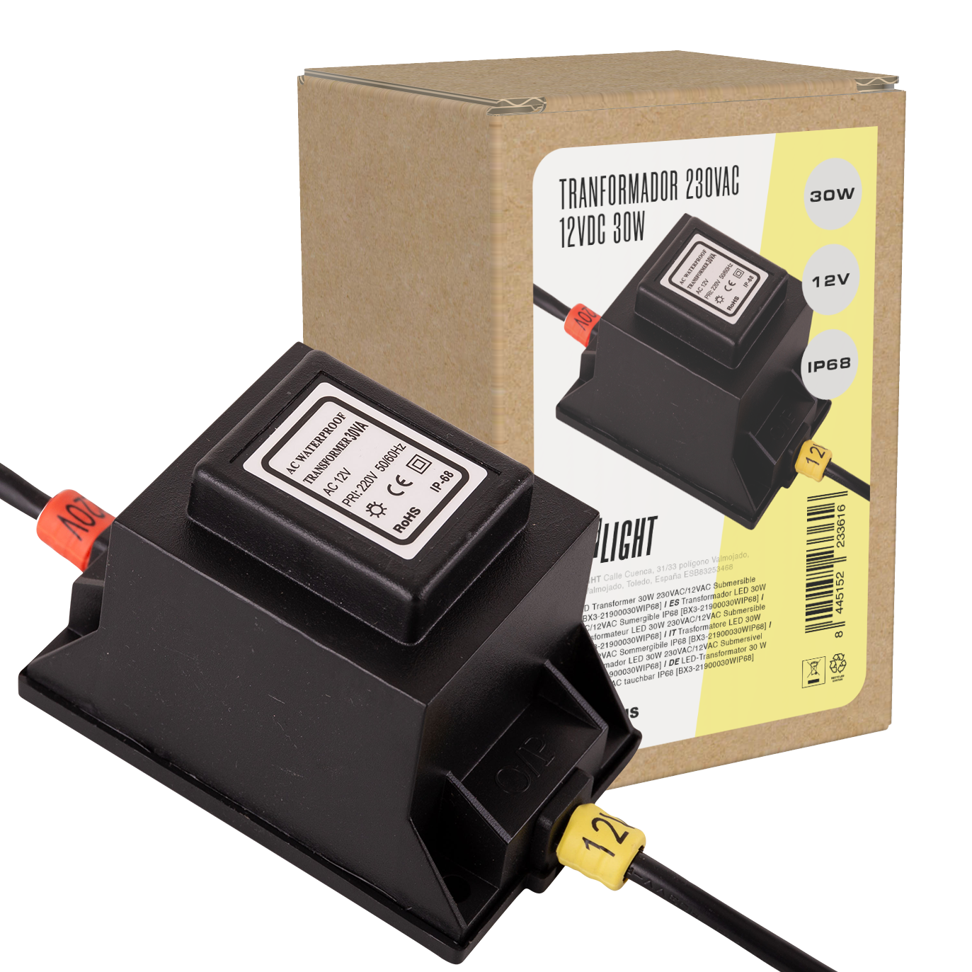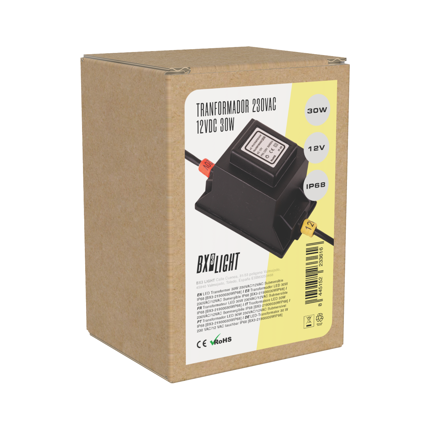 El Transformador LED 30 W 230 VAC/12 VAC Sumergible IP68 [BX3-21900030WIP68] de BX3 Light es una fuente de alimentación robusta y segura diseñada para sistemas de iluminación LED de baja tensión en entornos exigentes, incluyendo aplicaciones en exteriores y bajo el agua. Su alto grado de protección IP68 garantiza resistencia total a la inmersión y protección contra polvo, haciendo este equipo adecuado para proyectos que requieran alimentación estable de 12 V AC desde la red de 230 V AC. Características principales Entrada: 230 V AC (tensión de red) Salida: 12 V AC a 30 W Protección: IP68 sumergible, ideal para instalaciones exteriores y acuáticas. Potencia de salida: 30 W continua para alimentar luminarias LED de baja tensión.
