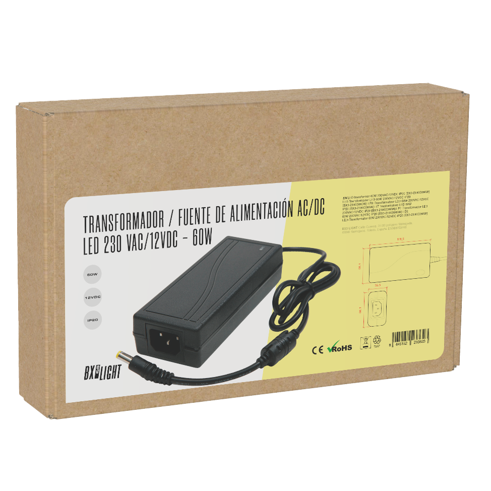 La Fuente de alimentación LED 60 W [BX3-21900060 W] de BX3 Light es un transformador electrónico AC/DC compacto y eficiente, diseñado para convertir la tensión de red 230 V AC a 12 V DC de forma estable, proporcionando una salida continua ideal para sistemas de iluminación LED de baja tensión. Es una solución especialmente indicada para proyectos interiores con consumo medio de potencia. Características técnicas Entrada: 230 V AC (red eléctrica doméstica) Salida: 12 V DC (corriente continua) Potencia nominal: 60 W (5 A) Protección: IP20 — apto para uso en interiores y entornos secos, protegido contra objetos sólidos >12 mm Regulación y seguridad: fuente regulada electrónicamente para evitar picos de tensión o corriente que puedan dañar las luminarias LED Diseño: carcasa robusta de material aislante (ABS/plástico), compacto para facilitar la instalación en espacios reducidos Frecuencia de trabajo: 50–60 Hz Certificaciones típicas: CE, RoHS, garantizando estándares de seguridad y calidad eléctrica Aplicaciones recomendadasEl Transformador LED 60 W 230 VAC/12 VDC IP20 BX3 Light está especialmente indicado para: Alimentación de tiras LED de 12 V Luminarias LED de baja tensión (MR16, G4, módulos LED) Iluminación decorativa y directa interiores Proyectos residenciales y comerciales con alimentación DC estable Ventajas Salida constante y protegida: evita picos que puedan afectar la vida útil de las luminarias LED.