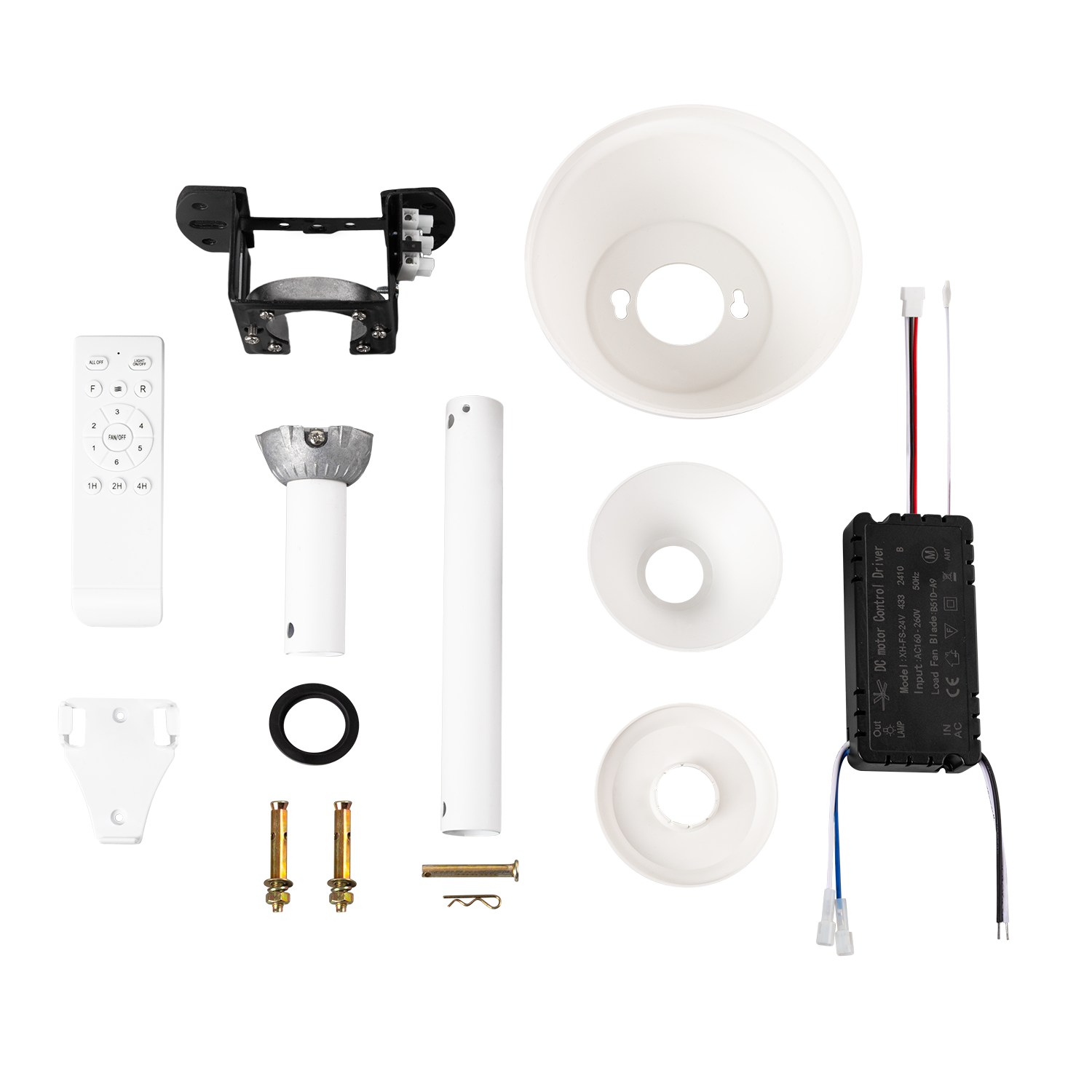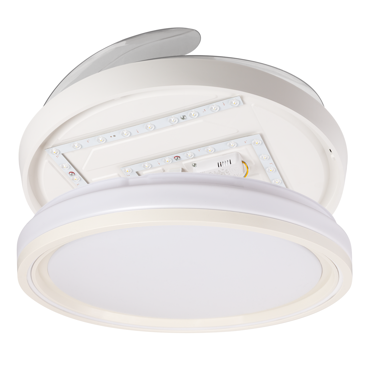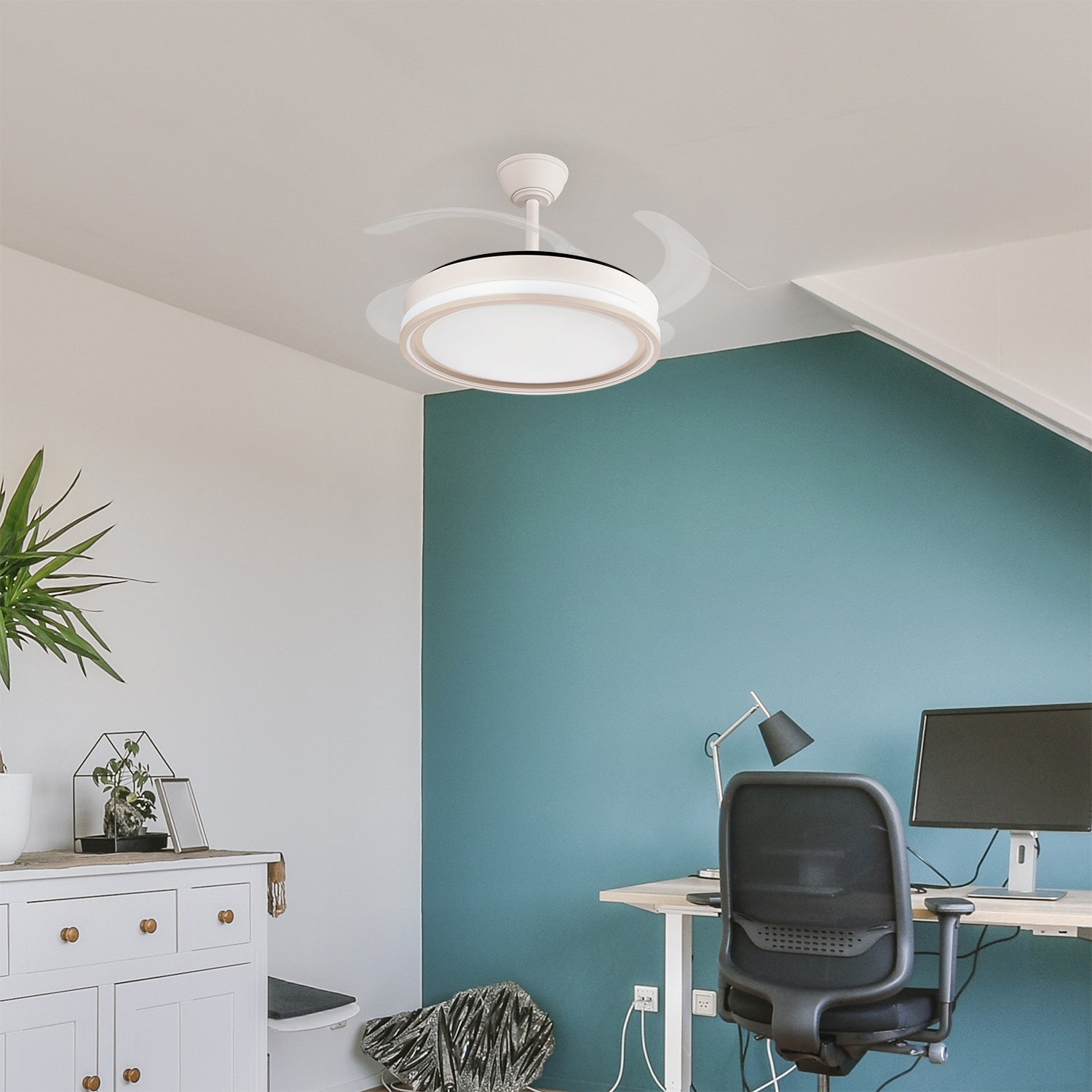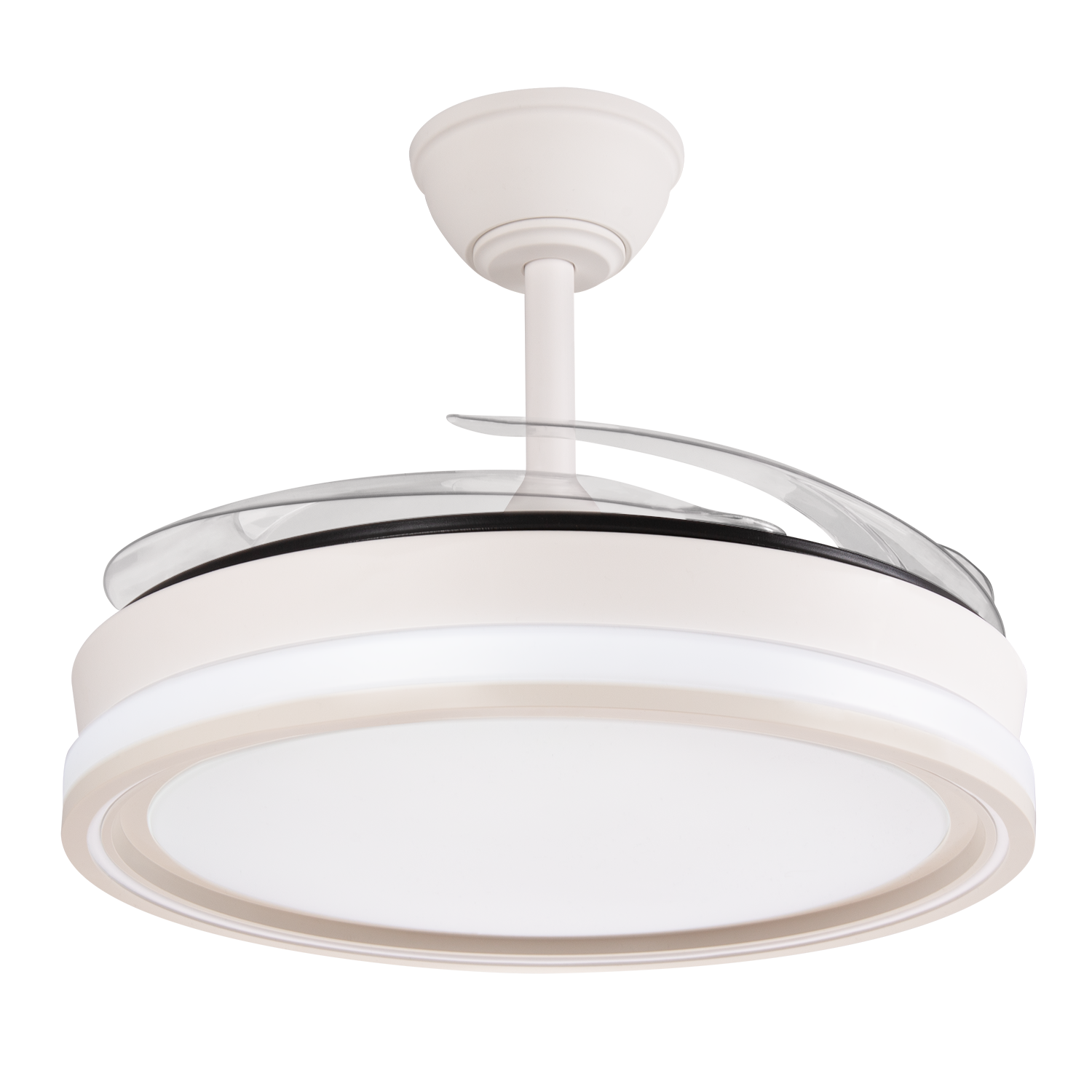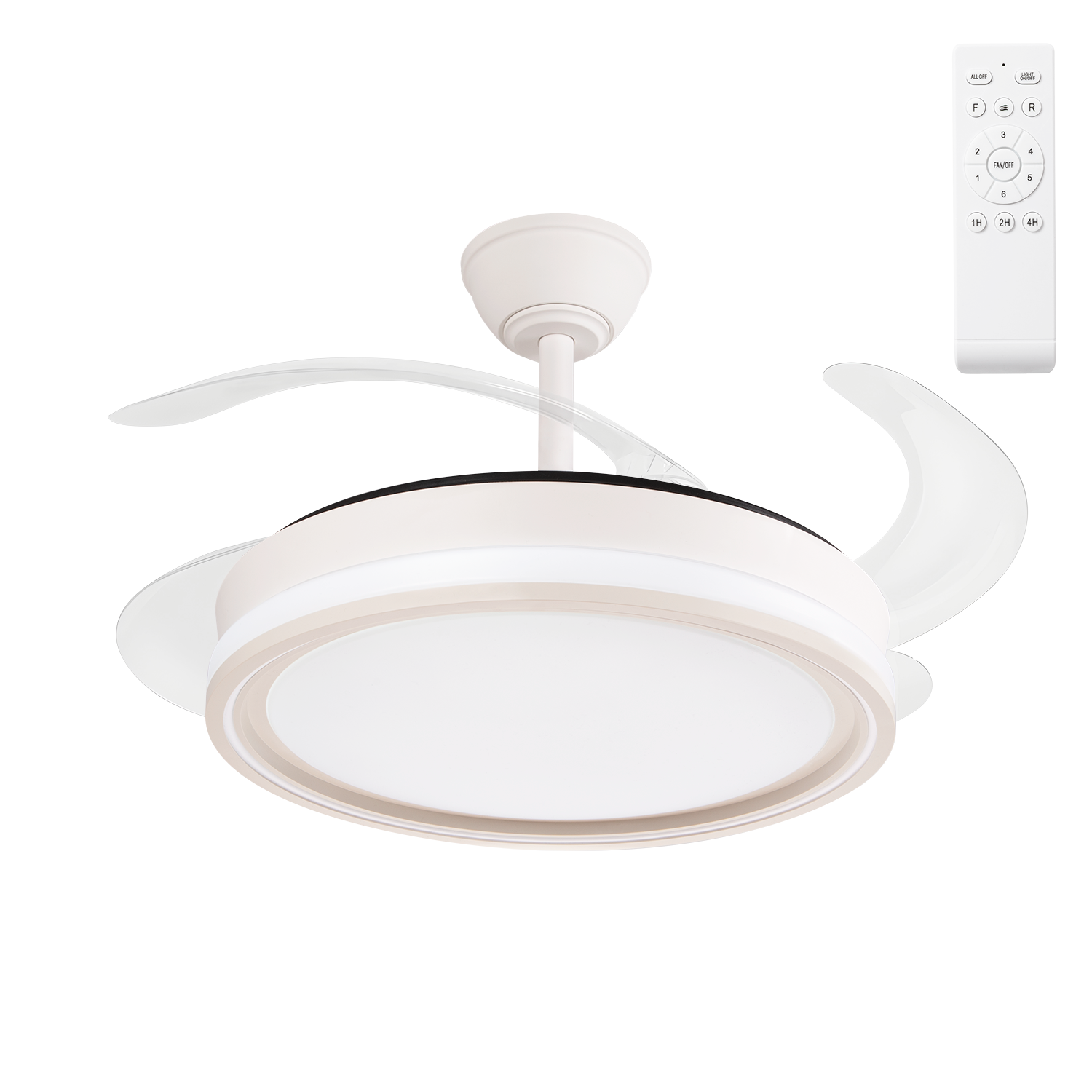 Ventilador DC realizado en metal, ABS y policarbonato en color blanco con cuatro aspas desplegables transparente muy resistentes. Tiene seis velocidades ajustables. Tecnología LED integrada con una potencia de 59 W, con 3 TEMPERATURAS SELECCIONABLES DE LUZ (3500-4000-6500K) y 5900 lúmenes. Control de aire verano o invierno.