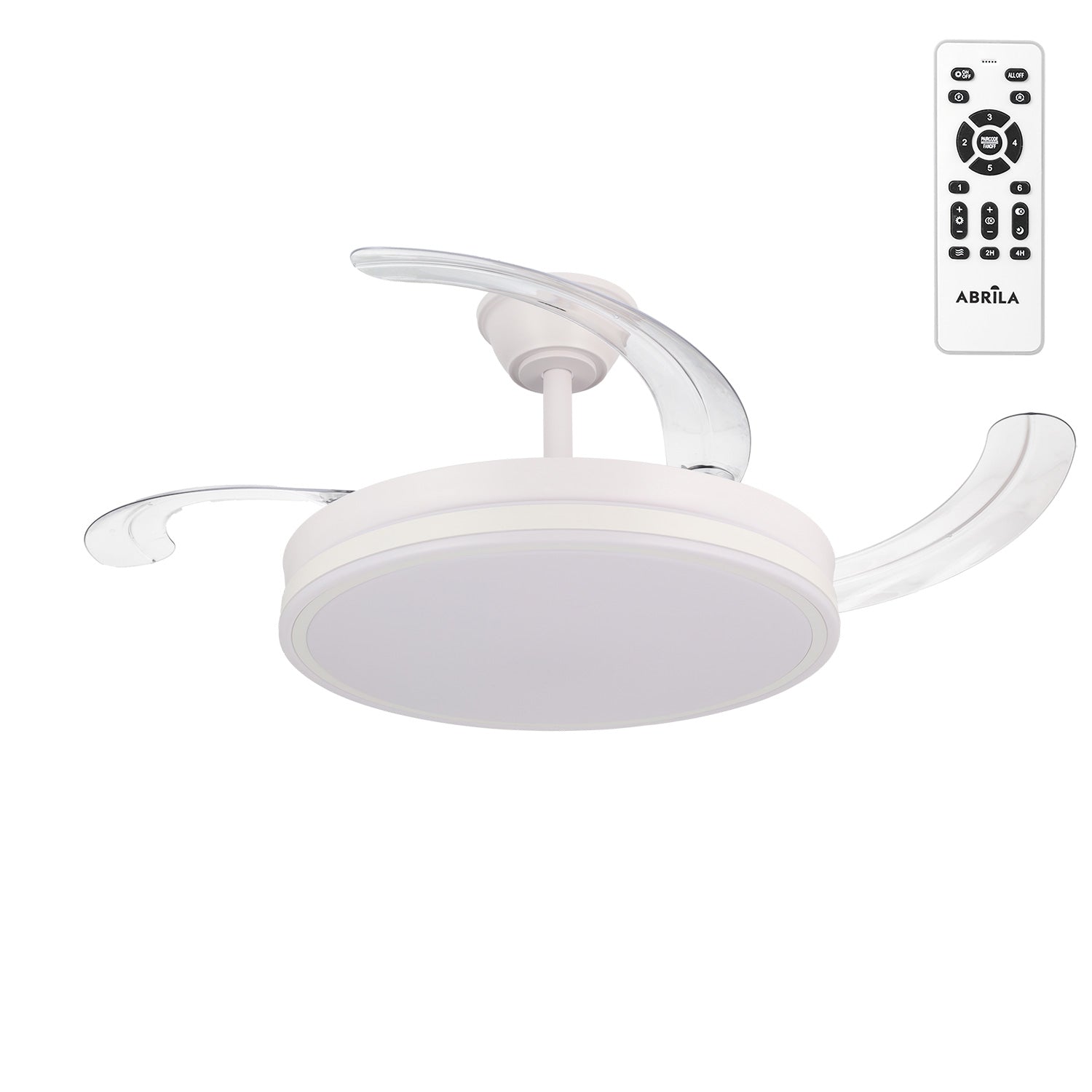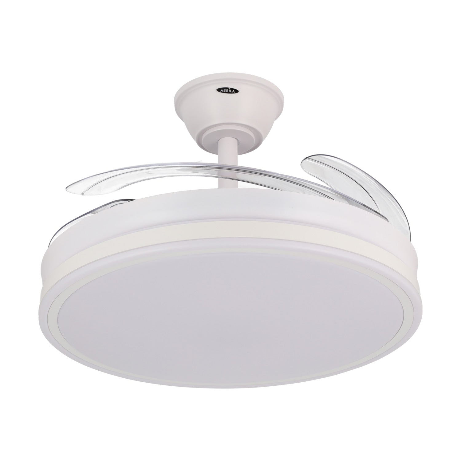 Ventilador DC de la serie ESCORPION realizado en metal, policarbonato y ABS, en color BLANCO con cuatro aspas DESPLEGABLES de ABS transparente muy resistentes. De diseño innovador, ideal para completar tanto en decoraciones modernas como clásicas, realizando tanto la función de lámpara como de ventilador. Motor DC con seis velocidades ajustables. Tecnología LED integrada con una potencia de 59 W, 6980 lúmenes y 3 TEMPERATURAS SELECCIONABLES DE LUZ (3000-4000-6000K) luz cálida, natural y blanco frío.